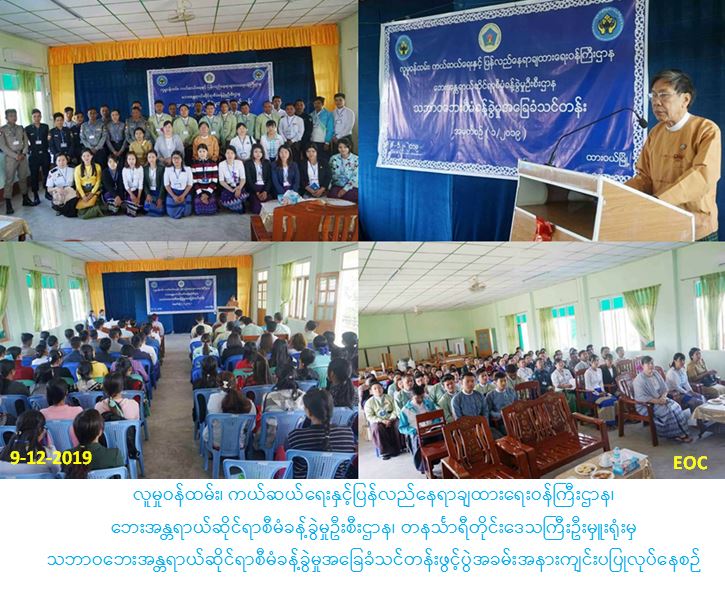 လူမှုဝန်ထမ်း၊ ကယ်ဆယ်ရေးနှင့် ပြန်လည်နေရာချထားရေးဝန်ကြီးဌာန၊ ဘေးအန္တရာယ်ဆိုင်ရာစီမံခန့်ခွဲမှုဦးစီးဌာန၊ တနင်္သာရီတိုင်းဒေသကြီး ဦးစီးမှူးရုံးမှ တာဝန်ရှိသူများသည် (၉-၁၂-၂၀၁၉) ရက်နေ့တွင် တနင်္သာရီတိုင်းဒေသကြီး၊ လူမှု၀န်းထမ်းဦးစီးဌာန၊ အိမ်တွင်းမှုသက်မွေးသင်တန်းကျောင်း ခန်းမ၌ သဘာဝဘေးအန္တရာယ်ဆိုင်ရာစီမံခန့်ခွဲမှုအခြေခံသင်တန်း(၁/၂၀၁၉) ဖွင့်ပွဲအခမ်းအနားအား တိုင်းဒေသကြီးအစိုးရအဖွဲ့၊ လူမှုရေးနှင့်စည်ပင်သာရေး ၀န်ကြီး၊ တိုင်းဒေသကြီးဌာနဆိုင်ရာများ၊ မြို့နယ်အုပ်ချုပ်ရေးမှူး/ဌာနဆိုင်ရာများနှင့် သင်တန်းသား/သင်တန်းသူ စုစုပေါင်းလူဦးရေ(၈၀) ဦးဖြင့် ဖွင့်လှစ်ခဲ့ပါကြောင်းသတင်းရရှိပါသည်။