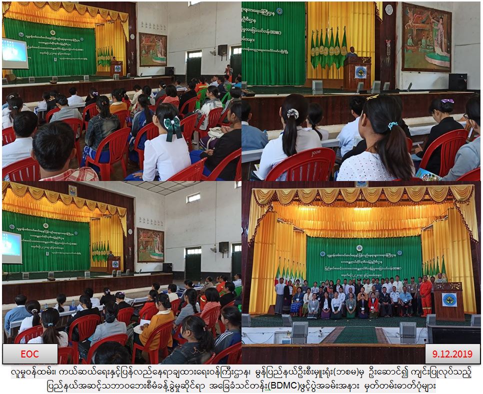 လူမှုဝန်ထမ်း၊ ကယ်ဆယ်ရေးနှင့်ပြန်လည်နေရာချထားရေးဝန်ကြီးဌာန၊ ဘေးအန္တရာယ်ဆိုင်ရာစီမံခန့်ခွဲမှုဦးစီးဌာန၊ မွန်ပြည်နယ်ဦးစီးမှူးရုံးမှ ဦးဆောင်၍ ပြည်နယ်အဆင့်သဘာဝဘေးစီမံခန့်ခွဲမှုဆိုင်ရာ အခြေခံသင်တန်း(BDMC)ဖွင့်ပွဲ အခမ်းအနားအား (၉.၁၂.၂၀၁၉)ရက်နေ့ (၀၉:၀၀)နာရီအချိန်တွင် မော်လမြိုင်မြို့ပညာရေးကောလိပ်ပညာညီလာခန်းမတွင် မြို့နယ်အဆင့်သဘာဝဘေးစီမံခန့်ခွဲမှုအဖွဲ့ ဝင်များ၊ အရပ်ဖက်လူမှုအဖွဲ့အစည်းများ၊ ရပ်ကျေးအုပ်ချုပ်ရေးမှူးများ၊ ပြည်နယ်အဆင့်ဌာနဆိုင်ရာများမှ သင်တန်းသား(၅၀)ဦး၊ စုစုပေါင်းအင်အား(၈၀)ဦးဖြင့် ဖွင့်လှစ်ခဲ့ပါသည်။ အဆိုပါအခမ်းအနားတွင် မွန်ပြည်နယ်အစိုးရအဖွဲ့ဝင် လူမှုရေးဝန်ကြီး ဒေါက်တာထိန်လင်းမှ အဖွင့်အမှာစကားပြောကြားခဲ့ပြီး ပြည်နယ်ဦးစီးမှူး ဦးသောင်းရွှေမှ သင်တန်းဖွင့်လှစ်ရခြင်း၏ ရည်ရွယ်ချက်အား ရှင်းလင်းပြောကြားခဲ့ကြောင်း သတင်းရရှိပါသည်။