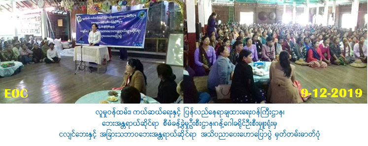 လူမှုဝန်ထမ်း၊ ကယ်ဆယ်ရေးနှင့်ပြန်လည်နေရာချထားရေးဝန်ကြီးဌာန၊ ဘေးအန္တရာယ်ဆိုင်ရာ စီမံခန့်ခွဲမှုဦးစီးဌာန၊ ဂန့်ဂေါခရိုင်ဦးစီးမှူးရုံးမှ တာဝန်ရှိသူများသည် (၉-၁၂-၂၀၁၉) ရက်နေ့(၁၂:၀၀) နာရီမှ (၁၃:၄၀) နာရီအထိ ဂန့်ဂေါခရိုင်၊ ဂန့်ဂေါမြို့ နယ်၊ ကန်ရွာကျေးရွာ၌ မိခင်နှင့်ကလေး စောင့်ရှောက်ရေး အဖွဲ့ဥက္ကဌနှင့် အဖွဲ့ဝင်များ၊ ပြန်ကြားရေးနှင့် ပြည်သူ့ဆက်ဆံရေးဦးစီးဌာန၊ စားသုံးသူရေးရာဦးစီးဌာနတို့နှင့် ပူးပေါင်း၍ ကျေးရွာ၊ ပြည်သူလူထု(၁၁၀၀) ဦးခန့်တို့အား ငလျင် ဘေးနှင့် အခြားသဘာဝဘေးအန္တရာယ်ဆိုင်ရာ အသိပညာပေးဟောပြောပွဲပြုလုပ်ခဲ့ပါကြောင်းနှင့် အသိပညာပေး လက်ကမ်းစာစောင်များ ဖြန့်ဝေ ပေးခဲ့ပါကြောင်းသတင်းရရှိပါသည်။