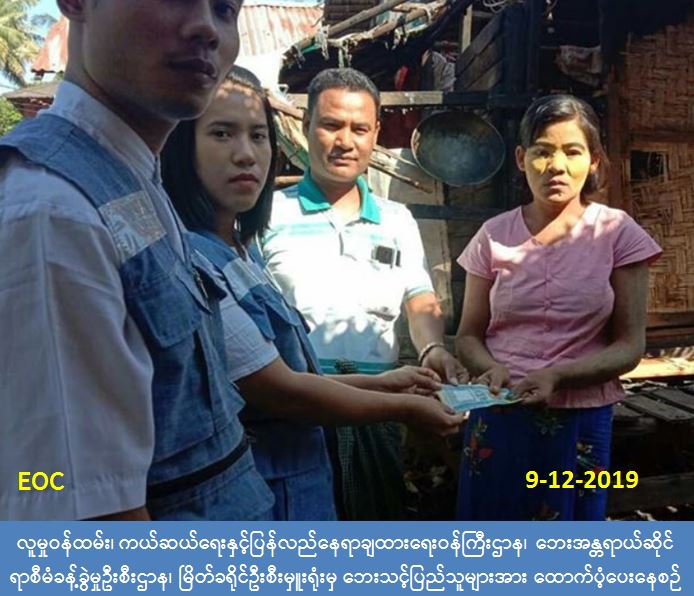 လူမှုဝန်ထမ်း၊ ကယ်ဆယ်ရေးနှင့်ပြန်လည်နေရာချထားရေးဝန်ကြီးဌာန၊ ဘေးအန္တရာယ် ဆိုင်ရာစီမံခန့်ခွဲမှုဦးစီးဌာန၊ မြိတ်ခရိုင်ဦးစီးမှူးရုံးမှ တာဝန်ရှိသူများက (၆-၁၂-၂၀၁၉) ရက်နေ့တွင်မြိတ်မြို့နယ် ၊ ရေပုန်းရပ်ကွက်မှ မီးလောင်မှုကြောင့် တစ်စိတ်တစ်ပိုင်းပျက်စီး ခဲ့သောနေအိမ်(၁) လုံးအတွက် အိမ်ဆောက်ပစ္စည်းဖိုးငွေ (၁၀,၅၀၀)ကျပ် (ဆုံးရုံးမှုတန်ဘိုး အတိုင်း) နှင့် လူ(၄) ဦးအတွက်ဆန်ရိက္ခာဖိုးငွေ(၈၄,၀၀) ကျပ်၊ စုစုပေါင်းငွေ (၁၈,၉၀၀) ကျပ် အား (၉-၁၂-၂၀၁၉) နေ့၊ နေ့လည် (၁၀:ဝဝ) နာရီအချိန်တွင် သွားရောက်ထောက်ပံ့ခဲ့ကြောင်း သတင်းရရှိပါသည်။