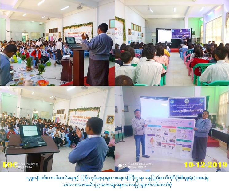 လူမှု၀န်ထမ်း၊ ကယ်ဆယ်ရေးနှင့်ပြန်လည်နေရာချထားရေး၀န်ကြီးဌာန၊ ဘေးအန္တရာယ်ဆိုင်ရာ စီမံခန့်ခွဲမှုဦးစီးဌာန၊ နေပြည်တော်တိုင်းဦးစီးမှူးရုံးမှ တာဝန်ရှိသူများသည် (၁၀-၁၂-၂၀၁၉) ရက်နေ့၊ (၀၉:၃၀) ချိန်မှ (၁၁:၀၀) ချိန်အထိ ဥတ္တရသီရိမြို့နယ်၊ Victorious Land ကိုယ်ပိုင်အထက်တန်း ကျောင်းတွင် ကျောင်းသား/သူ (၁၆၀) ဦးအား သဘာဝဘေးအန္တရာယ်များနှင့် ပတ်သက်၍ ဆောင်ရန်/ ရှောင်ရန် အချက်များအား သိရှိလိုက်နာဆောင်ရွက်နိုင်ရေးအတွက် သဘာဝဘေးအသိ ပညာပေးဟောပြောခြင်း၊ ငလျင်ဘေးဖြစ်ပွားလာပါက ဖြစ်ပွားနေစဉ် မည်ကဲ့သို့ပြုမူနေထိုင် ရမည်ကို အသိပညာပေးဟောပြောခြင်း၊ သဘာဝဘေးအသိပညာပေး လက်ကမ်းစာစောင်များ ဖြန့်ဝေခြင်း၊ ဗီနိုင်းပိုစတာနှင့် နံရံကပ်ပိုစတာများ ပေးအပ်ခဲ့ပါကြောင်းသတင်းရရှိပါသည်။