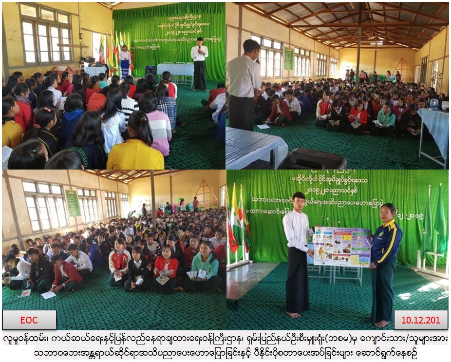 လူမှုဝန်ထမ်း၊ ကယ်ဆယ်ရေးနှင့်ပြန်လည်နေရာချထားရေးဝန်ကြီးဌာန၊ ဘေးအန္တရာယ်ဆိုင်ရာစီမံခန့်ခွဲမှုဦးစီးဌာန၊ ရှမ်းပြည်နယ်ဦးစီးမှူးရုံးမှ တာဝန်ရှိသူများသည် (၁၀.၁၂.၂၀၁၉)ရက်နေ့ နံနက် (၀၉:၃၀) အချိန်မှ( ၁၁:၀၀)အချိန်အထိ ပင်လောင်းမြို့နယ်၊ အထက ဆောင်းပြောင်း၌ ကျောင်းသား/သူ (၄၀၀)ဦးအား သဘာဝဘေးအသိပညာပေး ဟောပြောပွဲပြုလုပ်ခဲ့ပြီး လက်ကမ်းစာစောင်များ ဖြန့်ဝေခြင်း၊ ပညာပေးဗွီဒီယိုပြသခြင်းသရုပ်ပြသခြင်းများ ဆောင်ရွက်ခဲ့ကြောင်း သတင်းရရှိပါသည်။