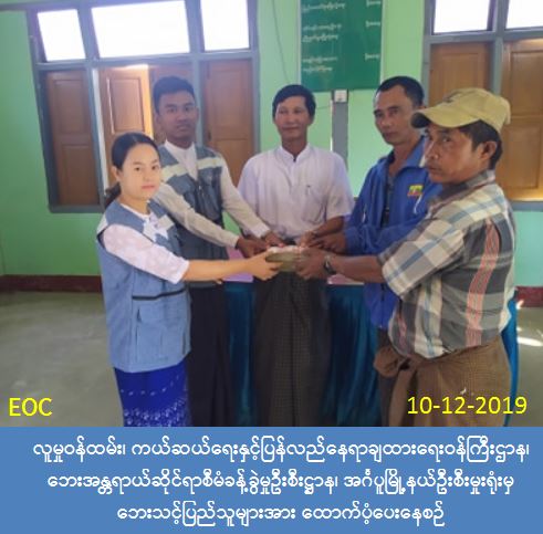 လူမှုဝန်ထမ်း၊ ကယ်ဆယ်ရေးနှင့်ပြန်လည်နေရာချထားရေးဝန်ကြီးဌာန၊ ဘေးအန္တရာယ်ဆိုင် ရာစီမံခန့်ခွဲမှုဦးစီးဋ္ဌာန၊ အင်္ဂပူမြို့နယ်ဦးစီးမှုးရုံး မှ တာဝန်ရှိသူများသည် အင်္ဂပူမြို့နယ်၊ သက္ကယ်တန်းအုပ်စု၊ ရွှေဝါထွန်းကျေးရွာတွင် (၅-၁၂-၂၀၁၉) နေ့တွင် ကမ်းပြိုဘေးသင့် အိမ်ခြေ(၁၂)လုံး၊ ၄င်းအိမ်ထောင်စု (၁၂) စုရှိ လူဦးရေ(၅၁) ဦးတို့အတွက် အိမ်ဆောက် ပစ္စည်းဖိုးငွေ(၁၂၀,၀၀၀၀) ကျပ် ဆန်ရိက္ခာဖိုးငွေ(၁၀,၇၁၀၀)ကျပ် စုစုပေါင်း ထောက်ပံ့ရန်ပုံ ငွေ(၁,၃၀၇,၁၀၀)ကျပ်ကို (၁၀-၁၂-၂၀၁၉) ရက်နေ့၌ တာဝန်ရှိသူများနှင့်အတူ ဘေးသင့် ပြည်သူများလက်၀ယ်သို့အရောက် ထောက်ပံပေးအပ်ခဲ့ကြောင်း သတင်းရရှိပါသည်။