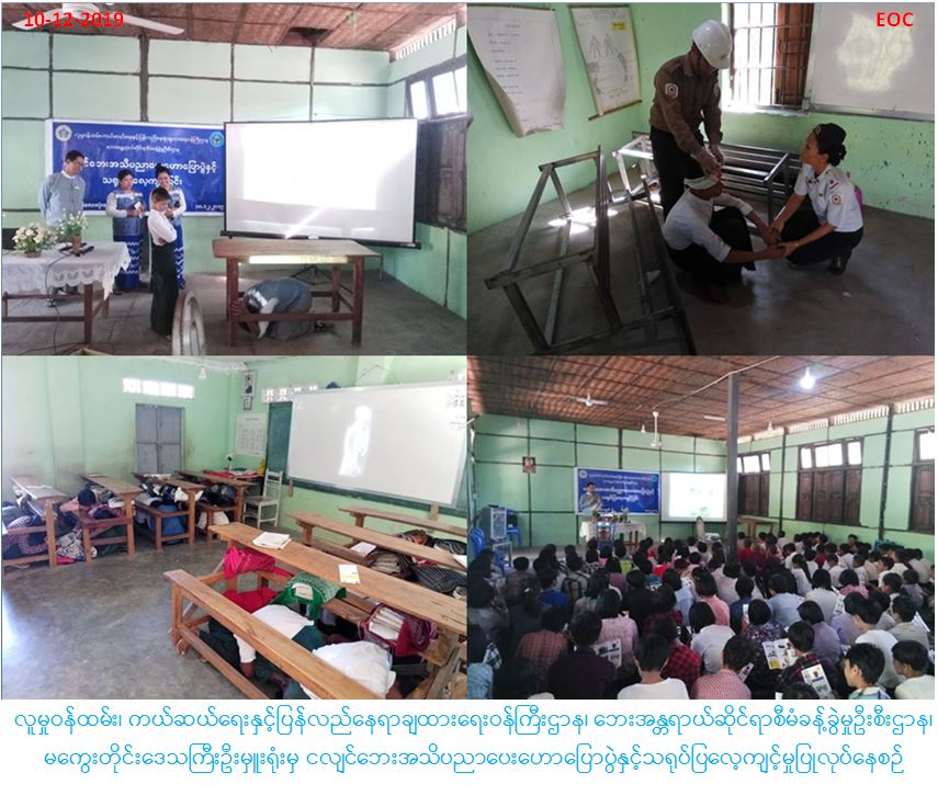 လူမှုဝန်ထမ်း၊ ကယ်ဆယ်ရေးနှင့် ပြန်လည်နေရာချထားရေးဝန်ကြီးဌာန၊ ဘေးအန္တရာယ်ဆိုင်ရာစီမံခန့်ခွဲမှုဦးစီးဌာန၊ မကွေးတိုင်းဒေသကြီးဦးစီးမှူးရုံးမှ တာဝန်ရှိသူများသည် ကြက်ခြေနီတပ်ဖွဲ့နှင့်ပူးပေါင်း၍ (၁၀-၁၂-၂၀၁၉) ရက်နေ့ (၁၃:၀၀) နာရီအချိန်တွင် မကွေးမြို့နယ်၊ အ.ထ.က ကျောင်း၊ ဖိုလေးလုံးကျေးရွာ တွင် ငလျင်ဘေးအန္တရာယ်နှင့်ပတ်သက်၍ ဟောပြောခြင်းနှင့် ငလျင်လှုပ်နေစဉ် ဘေးကင်းစွာနေထိုင်နည်းတို့ကို ဟောပြောခဲ့ရာ ဆရာ/ဆရာမ၊ ကျောင်းသား/သူ(၃၅၀)ဦး တက်ရောက်ခဲ့ပါသည်။ ထို့နောက် (၁၄:၀၀) နာရီတွင် ငလျင်ဘေးသဏ္ဌာန်တူဇာတ်တိုက်လေ့ကျင့်ခြင်းကို ဆောင်ရွက်ခဲ့ရာ အန္တရာယ်ကင်း စုဝေးရပ်သို့ ဆရာ/ဆရာမများ၊ ကြက်ခြေနီတပ်ဖွဲ့တို့၏ ကြီးကြပ်မှုဖြင့် ရွှေ့ပြောင်းခြင်း၊ အကာအကွယ်ယူခြင်း၊ ဒဏ်ရာရကျောင်းသား/သူများကို ရှေးဦးသူနာပြုစုကုသခြင်း၊ အရေးပေါ်လူနာများအား သတ်မှတ်ရာဆေးခန်းများသို့ ပို့ဆောင်ခြင်းတို့ကို အစီအစဉ်အတိုင်း ဆောင်ရွက်ခဲ့ပါကြောင်း နှင့် သဘာဝဘေးလက်ကမ်းစာစောင်များကိုလည်းဖြန့်ဝေပေးခဲ့ပါကြောင်း သတင်းရရှိပါသည်။