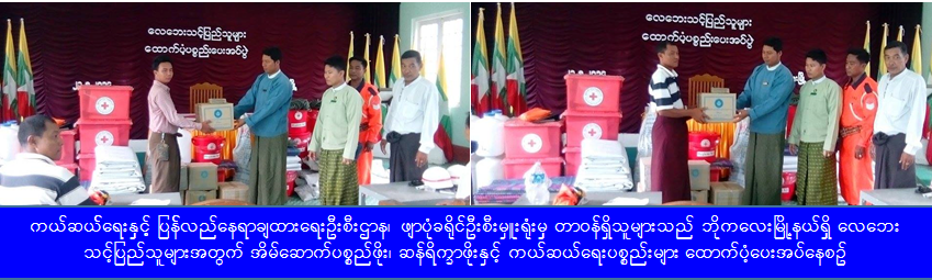 ကယ်ဆယ်ရေးနှင့် ပြန်လည်နေရာချထားရေးဦးစီးဌာနမှ တာဝန်ရှိသူများသည် ဖျာပုံခရိုင်၊ ဘိုကလေးမြို့နယ် ကဒုံကနိကျေးရွာအုပ်စု၊ မရမ်းချောင်းကျေးရွာ၌ (၂၂-၅-၂၀၁၆) ရက်နေ့တွင် တိုက်ခတ်ခဲ့သောလေပြင်းကြောင့် လေဘေးသင့်ပြည်သူ များအား ကယ်ဆယ်ရေးပစ္စည်းများ၊ အိမ်ဆောက်ပစ္စည်းဖိုး (၃၃၀,၀၀၀) ကျပ်နှင့် ဆန်ရိက္ခာဖိုး (၄၈,၆၀၀) ကျပ်တို့အား လေဘေးသင့်ပြည်သူများထံသို့ (၂၃-၅-၂၀၁၆) ရက်နေ့တွင် ထောက်ပံ့ပေးအပ်ခဲ့ပါကြောင်း သိရှိရပါသည်။ Source: ဖျာပုံခရိုင်ဦးစီးမှူးရုံး(ကဆရ)