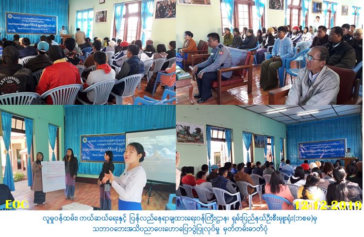 လူမှုဝန်ထမ်း၊ ကယ်ဆယ်ရေးနှင့်ပြန်လည်နေရာချထားရေးဝန်ကြီးဌာန၊ ဘေးအန္တရာယ်ဆိုင်ရာ စီမံခန့်ခွဲမှုဦးစီးဌာန၊ ရှမ်းပြည်နယ်ဦးစီးမှူးရုံးမှ တာဝန်ရှိသူများသည်(၁၂-၁၂-၂၀၁၉) ရက်နေ့တွင် လွိုင်လင်မြို့ အထွေထွေအုပ်ချုပ်ရေးဦးစီးဌာန၌ သဘာဝဘေးအန္တရာယ်ဆိုင်ရာ စီမံခန့်ခွဲမှု အခြေခံသင်တန်း(BDMC) ကို သင်တန်းသား (၃၀) ဦးတက်ရောက် ခဲ့ပါကြောင်းနှင့် အဆိုပါ သင်တန်းအား (၁၂-၁၂-၂၀၁၉) ရက်နေ့မှ (၁၄-၁၂-၂၀၁၉) ရက်နေ့ထိ ဖွင့်လှစ်သွားမည်ဖြစ်ပါ ကြောင်း သတင်းရရှိပါသည်။