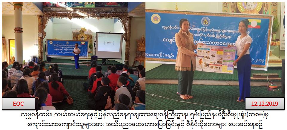 လူမှုဝန်ထမ်း၊ ကယ်ဆယ်ရေးနှင့်ပြန်လည်နေရာချထားရေးဝန်ကြီးဌာန၊ ဘေးအန္တရာယ်ဆိုင်ရာ စီမံခန့်ခွဲမှုဦးစီးဌာန ရှမ်းပြည်နယ်ဦးစီးမှူးရုံးမှ တာဝန်ရှိသူများသည် (၁၂.၁၂.၂၀၁၉)ရက်နေ့ နေ့လည် (၁၃:၀၀)အချိန်မှ (၁၄:၁၅)အထိ ပင်လောင်းမြို့နယ်၊ အထက(ခွဲ)ရေဦး၌ ကျောင်းသား/ သူ (၂၅၀)ဦးအားသဘာဝဘေးအသိပညာပေး ဟောပြောပွဲပြုလုပ်ခဲ့ပြီး လက်ကမ်းစာစောင်များ ဖြန့်ဝေခြင်း၊ ပညာပေးဗွီဒီယိုပြသခြင်းသရုပ်ပြသခြင်းများဆောင်ရွက်ခဲ့ကြောင်း သတင်းရရှိပါသည်။