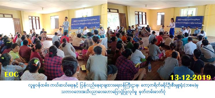 လူမှုဝန်ထမ်း၊ ကယ်ဆယ်ရေးနှင့် ပြန်လည်နေရာချထားရေးဝန်ကြီးဌာန၊ ဘေးအန္တရာယ်ဆိုင်ရာ စီမံခန့်ခွဲမှုဦးစီးဌာန၊ ကော့ကရိတ်ခရိုင်ဦးစီးမှူးရုံးမှ တာဝန်ရှိသူများသည် (၁၃-၁၂-၂၀၁၉) ရက်နေ့ တွင် နံနက်(၁၀:၀၀) နာရီချိန်မှ နေ့လည် (၁၁:၄၀) နာရီချိန်ထိ ပြန်ကြားရေးနှင့်ပြည်သူ့ ဆက်ဆံရေး ဦးစီးဌာန၊ စားသုံးသူရေးရာဦးစီးဌာနတို့နှင့် ပူးပေါင်း၍ ကော့ကရိတ်မြို့နယ်၊ ရေကျော်ကြီး ကျေးရွာ ရှိ ဓမ္မာရုံ၌ ကျေးရွာသား/သူ စုစုပေါင်း(၁၂၅) ဦးတို့အား ဦးစီးဌာနနှင့် ပတ်သက်သောလုပ်ငန်း တာဝန်များ၊ ထောက်ပံ့နှုန်းထားများ၊ သဘာဝဘေးဖြစ်ပွားလာပါက ကြိုတင်ပြင်ဆင်နိုင်ရန်အတွက် ဆောင်ရန်/ရှောင်ရန်များကို အသိပညာပေးဟောပြောခဲ့ပြီး လက်ကမ်းစာစောင်များကိုလည်းဖြန့် ဝေပေးခဲ့ပါကြောင်းသတင်းရရှိပါသည်။