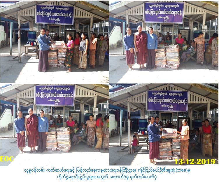 လူမှုဝန်ထမ်း၊ ကယ်ဆယ်ရေးနှင့် ပြန်လည်နေရာချထားရေးဝန်ကြီးဌာန၊ ဘေးအန္တရာယ်ဆိုင်ရာ စီမံခန့်ခွဲမှုဦးစီးဌာန၊ ရခိုင်ပြည်နယ်ဦးစီးမှူးရုံးမှ တာဝန်ရှိသူများသည် (၁၃-၁၂-၂၀၁၉) ရက်နေ့တွင် စစ်တွေမြို့နယ်၊ ဓမ္မရာမဘုန်းတော်ကြီးကျောင်း၌ ယာယီခိုလှုံနေထိုင်လျက်ရှိသော တိုက်ပွဲရှောင် အိမ်ထောင်စု (၃၁) စုအတွက် ဆော်ဒီစောင်(၃၁) ထည်အား သွားရောက် ထောက်ပံ့ပေးအပ်ခဲ့ပါ ကြောင်းသတင်းရရှိပါသည်။