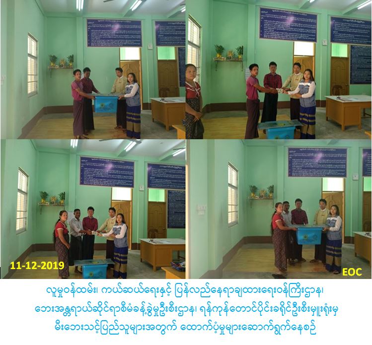 လူမှုဝန်ထမ်း၊ ကယ်ဆယ်ရေးနှင့် ပြန်လည်နေရာချထားရေးဝန်ကြီးဌာန၊ ဘေးအန္တရာယ်ဆိုင်ရာစီမံခန့်ခွဲမှုဦးစီးဌာန၊ ရန်ကုန်တောင်ပိုင်းခရိုင်ဦးစီးမှူးရုံးမှ တာဝန်ရှိသူများသည် ရန်ကုန်တောင်းပိုင်ခရိုင်၊ သန်လျင်မြို့နယ်၊ ဘုရားကုန်းကျေးရွာအုပ်စု၊ ကျိုက်အင်းကွက်သစ်ကျေးရွာတွင်(၁၀-၁၂-၂၀၁၉)ရက်နေ့ (၁၃:၂၀)နာရီအချိန်၌ မီးဘေးဖြစ်ပွားမှုကြောင့် ဘေးသင့်အိမ်ခြေ (၂)လုံးအတွက် အိမ်ဆောက်ပစ္စည်းဖိုးထောက်ပံ့ငွေ (၂၀၀၀၀၀/-)ကျပ်၊ ဘေးသင့်လူဦးရေ(၉)ဦး အတွက် ဆန်ရိက္ခာ(၇)ရက်စာဖိုးထောက်ပံ့ငွေ (၁၈၉၀၀/-)ကျပ်နှင့် ကယ်ဆယ်ရေးပစ္စည်း(၁၆)မျိုးပါ (၂)အိမ်ထောင်စာတို့အား (၁၃-၁၂-၂၀၁၉)ရက်နေ့တွင် မြို့နယ်အထွေထွေအုပ်ချုပ်ရေးဦးစီးဌာနမှတာဝန်ရှိသူများနှင့်အတူ ဘေးသင့်ပြည်သူများထံသို့ ထောက်ပံ့ပေးခဲ့ပါကြောင်း သတင်းရရှိပါသည်။