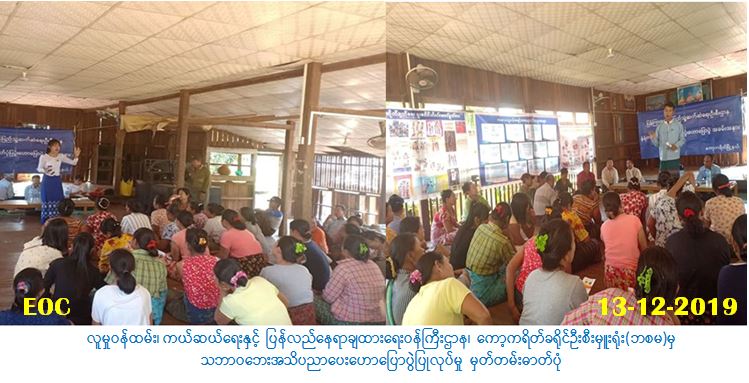 လူမှုဝန်ထမ်း၊ ကယ်ဆယ်ရေးနှင့် ပြန်လည်နေရာချထားရေးဝန်ကြီးဌာန၊ ဘေးအန္တရာယ်ဆိုင်ရာ စီမံခန့်ခွဲမှုဦးစီးဌာန၊ ကော့ကရိတ်ခရိုင်ဦးစီးမှူးရုံးမှ တာဝန်ရှိသူများသည် (၁၃-၁၂-၂၀၁၉) ရက်နေ့ တွင် (၁၂:၁၅) ချိန်မှ (၁၃:၃၀) ချိန်ထိ ပြန်ကြားရေးနှင့်ပြည်သူ့ဆက် ဆံရေးဦးစီးဌာန၊ စာသုံးသူ ရေးရာဦးစီးဌာနတို့နှင့် ပူးပေါင်း၍ ကော့ကရိတ်မြို့နယ်၊ ရေကျော်လေးကျေးရွာရှိ ဓမ္မာရုံ၌ ကျေးရွာသူ/သား စုစုပေါင်း (၁၀၀) ဦးတို့အား ဦးစီးဌာနနှင့် ပတ်သက်သောလုပ်ငန်းတာဝန်များ၊ ထောက်ပံ့နှုန်းထားများ၊သဘာဝဘေးဖြစ်ပွားလာပါက ကြိုတင်ပြင်ဆင်နိုင်ရန်အတွက် ဆောင်ရန်/ ရှောင်ရန်တို့ကို အသိပညာပေးဟောပြောခဲ့ပြီး လက်ကမ်းစာစောင်များလည်း ဖြန့်ဝေပေးခဲ့ပါ ကြောင်းသတင်းရရှိပါသည်။