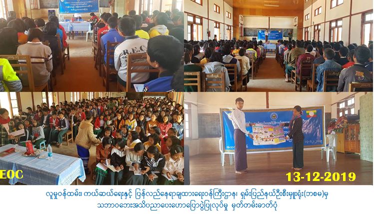 လူမှုဝန်ထမ်း၊ ကယ်ဆယ်ရေးနှင့် ပြန်လည်နေရာချထားရေးဝန်ကြီးဌာန၊ ဘေးအန္တရာယ်ဆိုင်ရာ စီမံခန့်ခွဲမှုဦးစီးဌာန၊ ရှမ်းပြည်နယ်ဦးစီးမှူးရုံးမှ တာဝန်ရှိသူများသည် (၁၃-၁၂-၂၀၁၉) ရက်နေ့တွင် နေ့လည် (၁၃:၀၀) အချိန်မှ (၁၄:၁၅) အထိ ပင်လောင်းမြို့နယ် အထကတီကျစ်၌ ကျောင်းသား/ သူ (၅၅၀) ဦးအားသဘာဝဘေးအသိပညာပေးဟောပြောပွဲပြုလုပ်ခဲ့ပြီး လက်ကမ်းစာစောင်များ ဖြန့်ဝေ ခြင်း၊ ပညာပေးဗွီဒီယိုပြသခြင်း၊ သရုပ်ပြသခြင်းများအား ပြုလုပ်ခဲ့ပါကြောင်းသတင်းရရှိပါသည်။