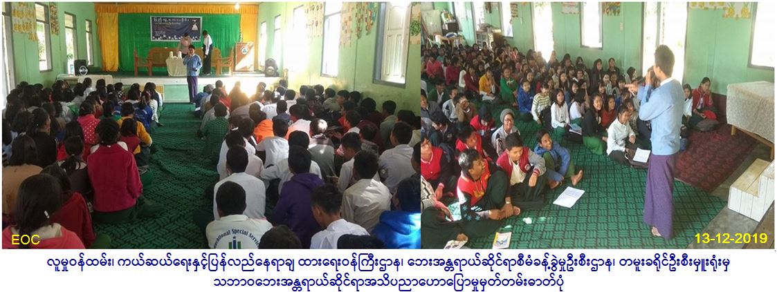 လူမှုဝန်ထမ်း၊ ကယ်ဆယ်ရေးနှင့်ပြန်လည်နေရာချ ထားရေးဝန်ကြီးဌာန၊ ဘေးအန္တရာယ်ဆိုင်ရာစီမံခန့်ခွဲမှုဦးစီးဌာန၊ တမူးခရိုင် ဦးစီးမှူးရုံးမှ တာဝန်ရှိသူများသည် (၁၃-၁၂-၂၀၁၉) နေ့ နံနက် (၁၁:၀၀)နာရီမှ (၁၂:၃၀)နာရီအချိန်ထိ ပြန်ကြားရေးနှင့် ပြည်သူ့ ဆက်ဆံရေးဦးစီးဌာနနှင့်ပူးပေါင်း၍ တမူးမြို့ အထက်တန်းကျောင်း(ခွဲ)တွင် ကျောင်းသား/သူ စုစုပေါင်း(၁၅၀)ဦးခန့်အား သဘာဝဘေးအန္တရာယ်ဆိုင်ရာအသိပညာများ ဟောပြောဆွေးနွေးခဲ့ပြီး လက်ကမ်းစာစောင်နှင့် နံရံကပ်ပိုစတာ များဖြန့်ဝေပေးခဲ့ ပါကြောင်း သတင်းရရှိပါသည်။