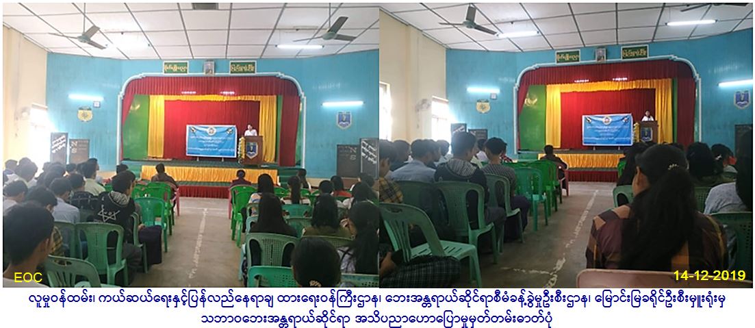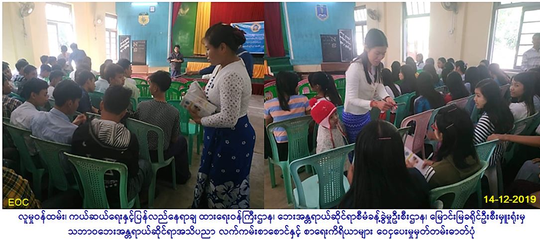 လူမှုဝန်ထမ်း၊ ကယ်ဆယ်ရေးနှင့်ပြန်လည်နေရာချထားရေးဝန်ကြီးဌာန၊ ဘေးအန္တရာယ်ဆိုင်ရာစီမံခန့်ခွဲမှုဦးစီးဌာန၊ မြောင်း မြခရိုင်ဦးစီးမှူးရုံးမှ တာဝန်ရှိသူများသည် (၁၄.၁၂.၂၀၁၉)ရက်နေ့၊ နံနက်(၁၀:၀၀)နာရီအချိန်တွင် မြောင်းမြမြို့နယ်၊ စိုက်ပျိုးရေး သိပ္ပံကျောင်းတွင် ကျောင်းသား/ကျောင်းသူ (၁၅၀) ဦးတို့အား သဘာဝဘေးအန္တရာယ်များနှင့်ဆိုင်သော အသိပညာပေး ဟောပြောခြင်းများဆောင်ရွက်ခဲ့ပြီး သဘာဝဘေးအသိပညာပေး လက်ကမ်းစာစောင်များနှင့် စာရေးကိရိယာများ ဝေငှခဲ့ပါကြောင်း သတင်းရရှိပါသည်။