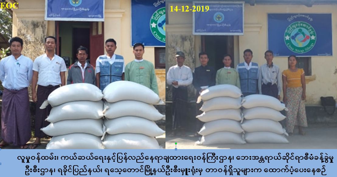 လူမှုဝန်ထမ်း၊ ကယ်ဆယ်ရေးနှင့်ပြန်လည်နေရာချထားရေးဝန်ကြီးဌာန၊ ဘေးအန္တရာယ်ဆိုင်ရာစီမံခန့် ခွဲမှုဦးစီးဌာန၊ ရခိုင်ပြည်နယ်၊ ရသေ့တောင်မြို့နယ်ဦးစီးမှူးရုံးမှ တာဝန်ရှိသူများသည် (၁၂-၁၂-၂၀၁၉) ရက်နေ့တွင် ရခိုင်ပြည်နယ်၊ ရသေ့တောင်မြို့နယ်အတွင်းရှိ တိုက်ပွဲရှောင်ပြည်သူများ နေရပ်စွန့်ခွာပြီး ယာယီခိုလှုံနေထိုင်လျက်ရှိသည့် စုရပ် (၅) ခု ခွဆုံကျေးရွာ၊ အုန်းချောင်းကျေးရွာ၊ စဖိုကျွန်းကျေးရွာ၊ ပြားချောင်းကြီးကျေးရွာ နှင့် ကုန်တန်းကျေးရွာရှိ တိုက်ပွဲရှောင် အိမ်ထောင်စု(၁၃၀) စု၊လူဦးရေ (၆၀၃) ဦး အတွက် ဆန်ရိက္ခာ(၁)လစာ ဆန် (၁၈၈) အိတ် (၁၀)ပြည်(၄)ဘူးအား မြို့နယ်အထွေထွေအုပ်ချုပ်ရေး ဦးစီးဌာနမှ တာဝန်ရှိသူများနှင့်အတူ ရပ်ကွက်ကျေးရွာအုပ်ချုပ်ရေးမှူးတို့ဖြင့် တိုက်ပွဲရှောင်ပြည်သူများ အား ထောက်ပံ့ပေးအပ်ခဲ့ကြောင်း သတင်းရရှိပါသည်။