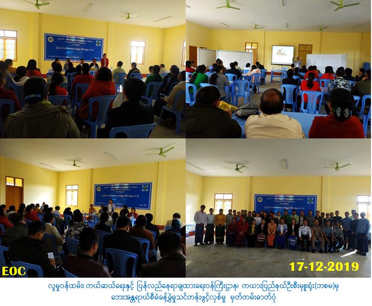 လူမှုဝန်ထမ်း၊ ကယ်ဆယ်ရေးနှင့် ပြန်လည်နေရာချထားရေးဝန်ကြီးဌာန၊ ဘေးအန္တရာယ်ဆိုင်ရာ စီမံခန့်ခွဲမှုဦးစီးဌာန၊ ကယားပြည်နယ်ဦးစီးမှူးရုံးမှ တာဝန်ရှိသူများသည် (၁၆-၁၂-၂၀၁၉) ရက်နေ့ (၀၈:၃၀) နာရီအချိန်တွင် ကျင်းပပြုလုပ်သည့် ပြည်နယ်ဆင့်သဘာ၀ ဘေးအန္တရာယ်စီမံခန့်ခွဲမှု သင်တန်းကို၊ (၁၆-၁၂-၂၀၁၉) ရက်နေ့မှ (၂၀-၁၂-၂၀၁၉) ရက်နေ့အထိ သင်တန်းကာလ (၅) ရက် တာဖြင့် သင်တန်းသား/သင်တန်းသူ (၄၅) ဦးတို့ဖြင့် ဖွင့်လှစ်သွားမည်ဖြစ်ကြောင်းသတင်း ရရှိပါသည်။