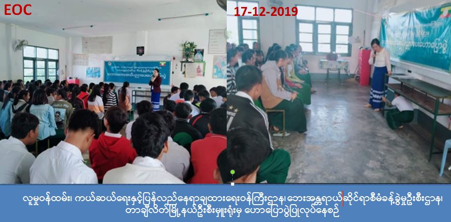 လူမှုဝန်ထမ်း၊ ကယ်ဆယ်ရေးနှင့်ပြန်လည်နေရာချထားရေးဝန်ကြီးဌာန၊ ဘေးအန္တရာယ် ဆိုင်ရာစီမံခန့်ခွဲမှုဦးစီးဌာန၊ တာချီလိတ်မြို့နယ်ဦးစီးမှူးရုံးမှ တာဝန်ရှိသူများသည် (၁၇-၁၂-၂၀၁၉) ရက်နေ့၊ နံနက် (၀၉:၃၀) နာရီမှ (၁၂:၀၀)နာရီအထိ တာချီလိတ်မြို့၊ ဟောင်လိတ်ကျေးရွာအုပ်စု၊ ရန်အောင်မြေရပ်ကွက်၊ အခြေခံအလယ်တန်းကျောင်းမှ ကျောင်းသား/ကျောင်းသူ စုစုပေါင်း (၁၂၀) ဦးအား သဘာဝဘေးနှင့်စပ်လျဉ်း၍ အသိပညာပေးဆွေးနွေးပွဲကျင်းပပြုလုပ်ခဲ့ရာ ရာသီဉတု ပြောင်းလဲခြင်းနှင့့်် ၄င်း၏ သက်ရောက်မှုများကြောင့် ဖြစ်ပွားတတ်သော ဘေးအန္တရာယ်များ၊ ဘေးအန္တရာယ် မဖြစ်ပွားမီ၊ ဖြစ်ပွားနေစဉ်နှင့် ဖြစ်ပွားပြီးနောက်ပိုင်း ဆောင်ရန်/ရှောင်ရန်များကို ဆွေးနွေး ဟောပြောခဲ့ပြီး ငလျင်လှုပ်ခတ်နေစဉ် နေထိုင်ရမည့် အနေအထားကို လက်တွေ့သရုပ်ပြသ ခြင်း၊ ဘေးအမျိုးအစားအလိုက် ဘေးကျရောက်လာပါက တုန့်ပြန်ဆောင်ရွက်သည့် အနေ အထားများကို ပြသခြင်း၊ ပူးပေါင်းပါဝင်မှု အားကောင်းစေရန် ဂိမ်းများကစားခြင်းဖြင့် ဆောင်ရွက်ခဲ့ပြီး တက်ရောက်လာသူများကို လက်ကမ်းစာဆောင်များ ဖြန့်ဝေပေးခဲ့ပါ ကြောင်းသတင်းရရှိပါသည်။