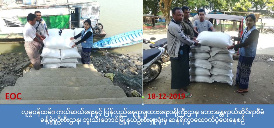 လူမှုဝန်ထမ်း၊ ကယ်ဆယ်ရေးနှင့် ပြန်လည်နေရာချထားရေးဝန်ကြီးဌာန၊ ဘေးအန္တရာယ် ဆိုင်ရာစီမံခန့်ခွဲမှုဦးစီးဌာန၊ ဘူးသီးတောင်မြို့နယ်ဦးစီးမှူးရုံးမှ တာဝန်ရှိသူများသည် တိုက်ပွဲ ဖြစ်ပွားမှုကြောင့် ဘူးသီးတောင်မြို့နယ်အတွင်းရှိ ရိက္ခာထပ်မံ လိုအပ်လျက်ရှိသော ဘူးသီး တောင်မြို့နယ်၊ ခွဆုံ(ဘင်္ဂါလီ) ကျေးရွာနှင့် ဖိုးခေါင်ချောင်း (ဘင်္ဂါလီ) ကျေးရွာ၊ စုစုပေါင်း စုရပ် စခန်း(၂) ခုရှိ တိုက်ပွဲရှောင်ပြည်သူ အိမ်ထောင်စု(၁၀၆) စု၊ လူဦးရေ (၅၁၇) ဦးအတွက် ဆန်ရိက္ခာ(၁) လ စာ ဆန်(၁၆၁) အိတ်၊(၁၃) ပြည်၊(၄) ဘူးအား(၁၈-၁၂-၂၀၁၉) ရက်နေ့တွင် ထောက်ပံပေးအပ်ခဲ့ကြောင်း သတင်းရရှိပါသည်။