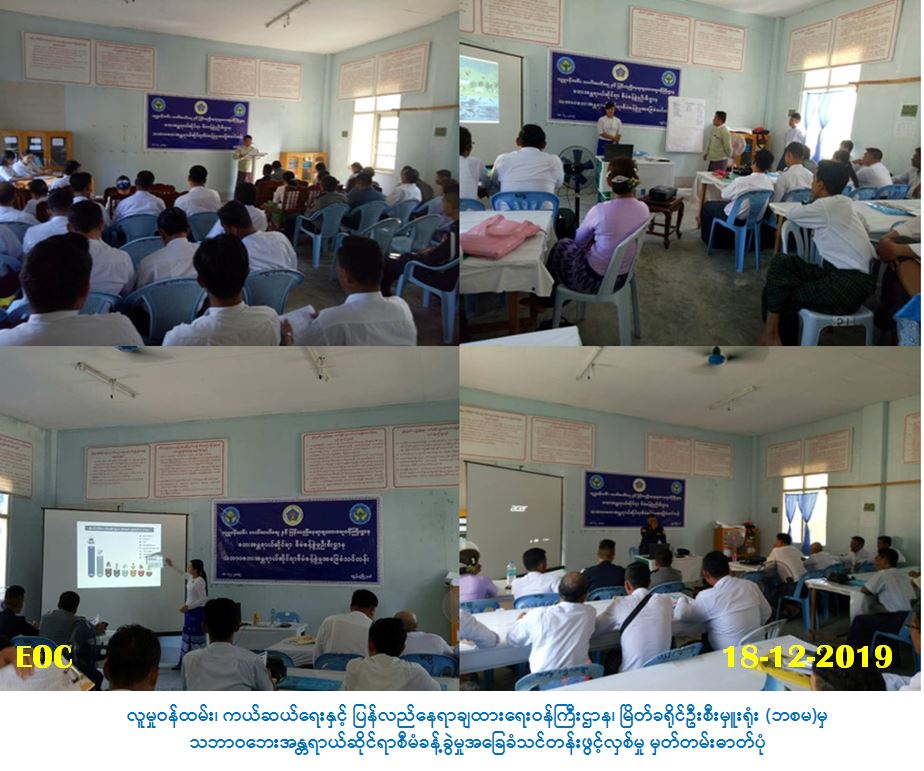 လူမှုဝန်ထမ်း၊ ကယ်ဆယ်ရေးနှင့် ပြန်လည်နေရာချထားရေးဝန်ကြီးဌာန၊ ဘေးအန္တရာယ်ဆိုင်ရာ စီမံခန့်ခွဲမှုဦးစီးဌာန၊ မြိတ်ခရိုင်ဦးစီးမှူးရုံးမှ တာဝန်ရှိသူများသည် (၁၈-၁၂-၂၀၁၉) ရက်နေ့တွင် သဘာဝဘေးအန္တရာယ်ဆိုင်ရာစီမံခန့်ခွဲမှုအခြေခံသင်တန်းကို ကျွန်းစုမြို့နယ် အထွေထွေအုပ်ချုပ် ရေးဦးစီးဌာနခန်းမ၌ သင်တန်းသား (၃၀) ဦးဖြင့် ဖွင့်လှစ်ခဲ့ရာ မိုးဇလဦးစီးဌာန၊ မီးသတ်နှင့် ကျန်းမာရေးဦးစီးဌာနတို့မှ သက်ဆိုင်ရာသင်ခန်းစာများအား ပူးပေါင်းပါဝင်ဆွေးနွေးခဲ့ပါကြောင်း သတင်းရရှိပါသည်။