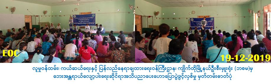 လူမှု၀န်ထမ်း၊ ကယ်ဆယ်ရေးနှင့် ပြန်လည်နေရာချထားရေး၀န်ကြီးဌာန၊ ဘေးအန္တရာယ်ဆိုင်ရာ စီမံခန့်ခွဲမှုဦးစီးဌာန၊ မွန်ပြည်နယ်၊ သထုံခရိုင်၊ ကျိုက်ထိုမြို့နယ်ဦးစီးမှူးရုံးမှ တာ၀န်ရှိသူများသည် (၁၉-၁၂-၂၀၁၉) ရက်နေ့၊ (၁၀:၀၀) နာရီမှ (၁၁:၃၀) နာရီအထိ ကွင်းကလေးကျေးရွာအုပ်စု၊ တောင်ကလေးကျေးရွာ၊ ဓမ္မာရုံတွင် ဘေးအန္တရာယ်လျော့ပါးရေးဆိုင်ရာအသိပညာပေး ဟောပြောဆွေးနွေးခြင်းအား ကျင်းပပြုလုပ်ခဲ့ရာ ပြည်သူလူထု (၂၀၀) ဦးခန့်တက်ရောက်ခဲ့ကြောင်း သတင်း ရရှိပါသည်။