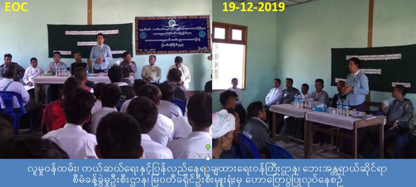 လူမှုဝန်ထမ်း၊ ကယ်ဆယ်ရေးနှင့်ပြန်လည်နေရာချထားရေးဝန်ကြီးဌာန၊ ဘေးအန္တရာယ် ဆိုင်ရာစီမံခန့်ခွဲမှုဦးစီးဌာန၊ မြဝတီခရိုင်ဦးစီးမှူးရုံးမှ တာဝန်ရှိသူများသည် (၁၈-၁၂-၂၀၁၉) ရက်နေ့တွင် စုကလိမြို့၊ (အ.ထ.က) ကျောင်း တွင် ကျောင်းသား/ကျောင်းသူ ဦးရေ (၁၀၀) ကျော်အား သဘာဝဘေးအသိပညာပေး ဟောပြောခြင်း၊ တက်ရောက်လာသူများအား အသိ ပညာပေးလက်ကမ်းစာစောင်များ ဝေငှပေးခြင်းတို့ ဆောင်ရွက်ခဲ့ကြပါကြောင်း သတင်းရရှိ ပါသည်။