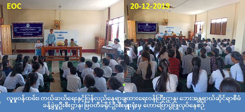 လူမှုဝန်ထမ်း၊ ကယ်ဆယ်ရေးနှင့်ပြန်လည်နေရာချထားရေးဝန်ကြီးဌာန၊ ဘေးအန္တရာယ် ဆိုင်ရာစီမံခန့်ခွဲမှုဦးစီးဌာန၊ မြဝတီခရိုင်ဦးစီးမှူးရုံးမှ တာဝန်ရှိသူများသည် (၁၉-၁၂-၂၀၁၉) ရက်နေ့တွင် ဝေါလေမြိုင်မြို့၊ (အ.ထ.က) ကျောင်း တွင် ကျောင်းသား/ကျောင်းသူ ဦးရေ (၁၀၀) ကျော်အား သဘာဝဘေး အသိပညာပေးဟောပြောခြင်း၊ တက်ရောက်လာသူများအား အသိပညာပေးလက်ကမ်းစာစောင်များ ဝေငှပေးခြင်းတို့ ဆောင်ရွက်ခဲ့ကြပါကြောင်း သတင်းရရှိပါသည်။