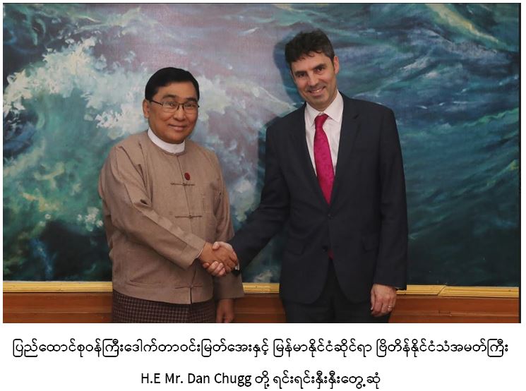 လူမှုဝန်ထမ်း၊ ကယ်ဆယ်ရေးနှင့်ပြန်လည်နေရာချထားရေးဝန်ကြီးဌာန၊ ပြည်ထောင်စုဝန်ကြီး ဒေါက်တာဝင်းမြတ်အေး မြန်မာနိုင်ငံဆိုင်ရာဗြိတိန်နိုင်ငံသံအမတ်ကြီး H.E. Mr. Dan Chugg အား ယမန်နေ့ မွန်းလွဲပိုင်းက အဆိုပါဝန်ကြီးရုံး မေခလာခန်းမ၌ လက်ခံတွေ့ဆုံခဲ့ပါသည်။