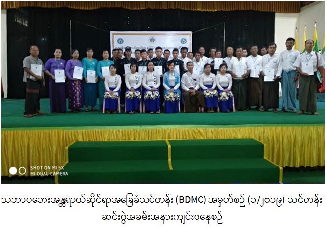 လူမှု၀န်ထမ်း၊ ကယ်ဆယ်ရေးနှင့် ပြန်လည်နေရာချထားရေး၀န်ကြီးဌာန၊ ဘေးအန္တရာယ်ဆိုင်ရာ စီမံခန့်ခွဲမှုဦးစီးဌာန၊ သထုံခရိုင်ဘေးအန္တရာယ်ဆိုင်ရာ စီမံခန့်ခွဲမှုဉီးစီးဌာနမှ ဉီးဆောင်၍ သဘာဝဘေးအန္တရာယ်ဆိုင်ရာ အခြေခံသင်တန်း (BDMC) အမှတ်စဉ် (၁/၂၀၁၉) အား (၁၈.၁၂.၂၀၁၉) ရက်နေ့မှ (၂၀.၁၂.၂၀၁၉) ရက်နေ့အထိ သင်တန်းသား/သူ (၃၀) ဉီး ဖြင့် သထုံမြို့နယ် ၊ သုဝဏ္ဍခန်းမတွင် ဖွင့်လှစ်ခဲ့ရာ (၂၀.၁၂.၂၀၁၉) ရက်နေ့၊ (၁၆:၃၀)နာရီတွင် သင်တန်းဆင်းပွဲ ပြုလုပ်ပြီးစီးခဲ့ပါကြောင်း သတင်းရရှိပါသည်။