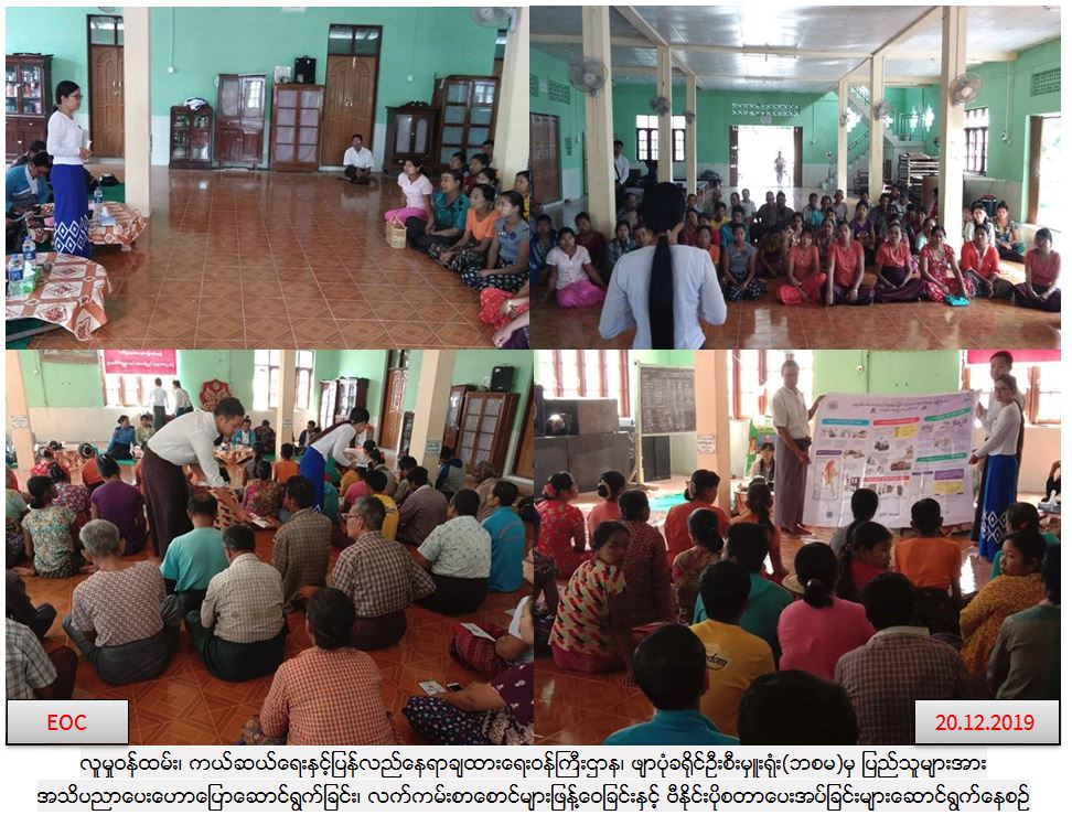 လူမှုဝန်ထမ်း၊ ကယ်ဆယ်ရေးနှင့်ပြန်လည်နေရာချထားရေးဝန်ကြီးဌာန၊ ဖျာပုံခရိုင်ဦးစီးမှူးရုံးမှ တာဝန်ရှိသူများသည် (၂၀.၁၂.၂၀၁၉)နေ့တွင် ဖျာပုံမြို့နယ်၊ ကျုံကဒွန်းကျေးရွာအုပ်စုကျုံကဒွန်း ကျေးရွာဘုန်းတော်ကြီးကျောင်းတွင် သဘာဝဘေးလျော့ပါးရေး အသိပညာပေးဟောပြောပွဲကျင်းပခဲ့ရာ ကျေးရွာသူ/သား(၁၀၀)ဦး တက်ရောက်ခဲ့ပြီး လက်ကမ်းစာစောင်များ၊ ဗီနိုင်းပိုစတာများဖြန့်ဝေအသိပညာပေးခဲ့ကြောင်း သတင်းရရှိပါသည်။