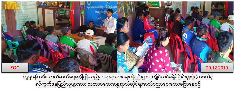 လူမှုဝန်ထမ်း၊ ကယ်ဆယ်ရေးနှင့်ပြန်လည်နေရာချထားရေးဝန်ကြီးဌာန၊ ဘေးအန္တရာယ်ဆိုင်ရာစီမံခန့်ခွဲမှုဦးစီးဌာနl လွိုင်လင်ခရိုင်ဦးစီးမှူးရုံးမှ တာဝန်ရှိသူများသည် (၂၁.၁၂.၂၀၁၉)ရက်နေ့ နံနက်(၁၀:၀၀)နာရီမှ(၁၂:၀၀)နာရီအချိန်ထိ လွိုင်လင်မြို့၊ ရပ်ကွက်(၄)၊ အုပ်ချုပ်ရေးမှူး အစည်းအဝေးခန်းမှ၌ ရပ်ကွက်သူ/ရပ်ကွက်သား (၇၀)ဦးခန့်အား မိမိတို့ဌာန၏ လုပ်ငန်းတာဝန်များကို ရှင်းလင်းပြောကြားခြင်း၊ သဘာဝဘေး အသိပညာပေး ဟောပြောခြင်း၊ ဘေး(၈)မျိုး လက်ကမ်းစာစောင်များ ပေးဝေခြင်းနှင့် တက်ရောက်လာသူများမှ မေးမြန်းချက်များကိုဖြေကြားခြင်းများ ဆောင်ရွက်ခဲ့ကြောင်း သတင်းရရှိပါသည်။