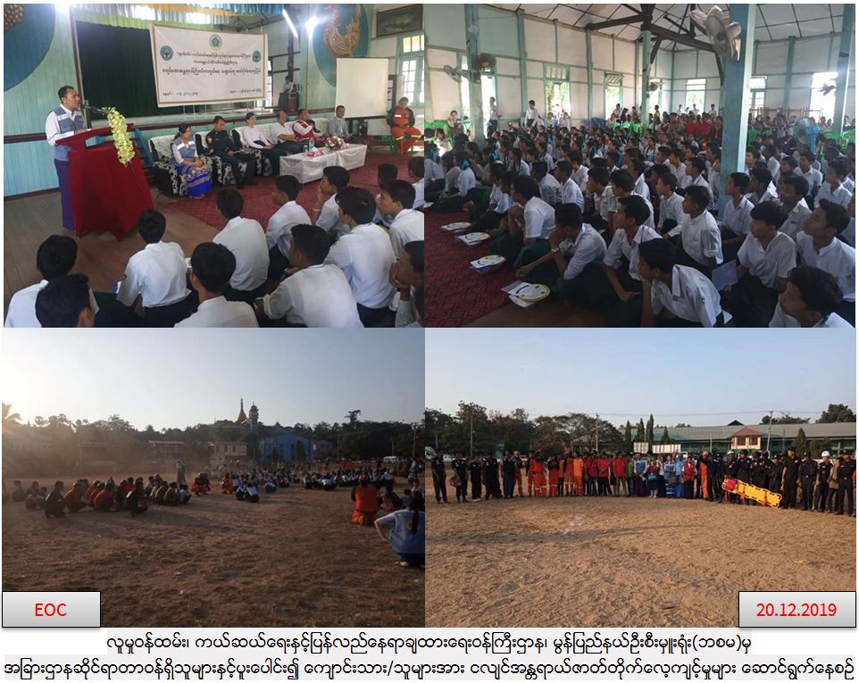 လူမှုဝန်ထမ်း၊ ကယ်ဆယ်ရေးနှင့်ပြန်လည်နေရာချထားရေး၊ဘေးအန္တရာယ်ဆိုင်ရာစီမံခန့်ခွဲမှုဦးစီးဌာန၊ မွန်ပြည်နယ်ဦးစီးမှူးရုံးမှ တာဝန်ရှိသူများနှင့် မြို့နယ်သဘာဝဘေးစီမံခန့်ခွဲမှုအဖွဲ့ဝင်များ၊ အရပ်ဘက်လူမှုအဖွဲ့အစည်းများပူးပေါင်း၍ (၂၀-၁၂-၂၀၁၉)ရက်နေ့တွင် မော်လမြိုင်မြို့ လှိုင်ရပ်ကွက်၊ အထက(၂)၌ ငလျင်ဘေးအန္တရာယ်သဏ္ဍန်တူဇာတ်တိုက်လေ့ကျင့်ခြင်းကိုပြုလုပ်ခဲ့ရာ ကျောင်းသား/ ကျောင်းသူများ၊ ရပ်ကွက်နေပြည်သူများ စုစုပေါင်းအင်အား(၄၀၀)ဦးခန့် ပါဝင်ဆောင်ရွက်ခဲ့ပြီး တက်ရောက်လာသူများအား သဘာဝဘေးအသိပညာပေးလက်ကမ်းစာစောင်များဖြန့်ဝေပေးခဲ့ကြောင်း သတင်းရရှိပါသည်။