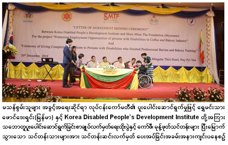 ရွှေမင်းသားဖောင်ဒေးရှင်း(မြန်မာ)နှင့် Korea Disabled People’s Development Institute (KODDI)တို့အကြား သဘောတူပူးပေါင်းဆောင်ရွက်ခြင်းအတွက် လက်မှတ်ရေးထိုးပွဲ၊ ကော်ဖီနှင့် မုန့်ဖုတ်သင်တန်း သင်တန်းဆင်းပွဲအခမ်းအနားကို ယနေ့မွန်းလွဲပိုင်းတွင် နေပြည်တော်ရှိ မင်္ဂလာသီရိဟိုတယ်တွင် ကျင်းပပြုလုပ်ခဲ့ရာ လူမှုဝန်ထမ်း၊ ကယ်ဆယ်ရေးနှင့် ပြန်လည်နေရာ ချထားရေးဝန်ကြီးဌာန၊ ဒုတိယဝန်ကြီး၊ ကျန်းမာရေးနှင့် အားကစားဝန်ကြီးဌာန၊ ဒုတိယဝန်ကြီး၊ ပြည်ထောင်စုအစိုးရအဖွဲ့ရုံးဝန်ကြီးဌာန၊ ဒုတိယဝန်ကြီး၊ စီမံကိန်း၊ ဘဏ္ဍာရေးနှင့် စက်မှုဝန်ကြီးဌာန၊ အမြဲတမ်းအတွင်းဝန်၊ နေပြည်တော်ကောင်စီဝင် (၂)၊ ပြည်သူ့လွှတ်တော်၊ အစိုးရ၏ အာမခံချက်များ၊ ကတိများနှင့် တာဝန်ခံချက်များစိစစ်ရေးကော်မတီ ဥက္ကဋ္ဌ၊ အမျိုးသားလွှတ်တော်နှင့် ပြည်သူ့ လွှတ်တော်ကိုယ်စားလှယ်များ ၊ ဌာနဆိုင်ရာအသီးသီးမှတာဝန်ရှိသူများ၊ Korea Disabled People’s Development Institute (KODDI) မှ တာဝန်ရှိသူများ၊ ရွှေမင်းသားဖောင်ဒေးရှင်းနှင့် မသန်စွမ်း အဖွဲ့အစည်းတို့မှ ကိုယ်စားလှယ်များ တက်ရောက်ခဲ့ကြပါသည်။