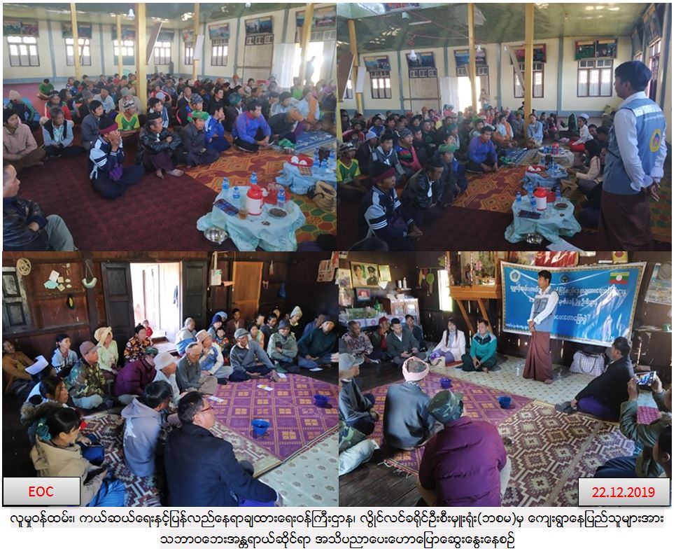 လူမှုဝန်ထမ်း၊ ကယ်ဆယ်ရေးနှင့်ပြန်လည်နေရာချထားရေးဝန်ကြီးဌာန၊ ဘေးအန္တရာယ်ဆိုင်ရာစီမံခန့်ခွဲမှုဦးစီးဌာနl လွိုင်လင်ခရိုင်ဦးစီးမှူးရုံးမှ တာဝန်ရှိသူများသည် (22.12.2019)ရက်နေ့ နံနက်(9.00)နာရီမှ(11.00)နာရီ အချိန်ထိ လွိုင်လင်မြို့နယ်၊ တောင်နောက်ကျေးရွာအုပ်စု၊ နောင်ဟင့်ကျေးရွာရှိ ရွာသူ/ရွာသား (၆၀) ဦးခန့်အား သဘာဝအသိပညာ ပေးဟောပြောပွဲပြုလုပ်ခဲ့ပြီး ဆက်လက်၍ (12.00)နာရီမှ(2.00)နာရီ အချိန်ထိ နောင်ယားဆိုင်းကျေးရွာ ရွာသူ/ရွာသား(၂၀၀) ဦးခန့်အား ဌာန၏လုပ်ငန်းတာဝန်များကို ရှင်းလင်းပြောကြားခြင်း၊ သဘာဝဘေးအသိပညာပေး ဟောပြောခြင်း၊ ဘေး(၈)မျိုး လက်ကမ်း စာစောင်များ ပေးဝေခြင်းနှင့် တက်ရောက်လာသူများမှ မေးမြန်းချက်များကိုဖြေကြားခြင်းများ ဆောင်ရွက်ခဲ့ကြောင်း သတင်းရရှိပါသည်။