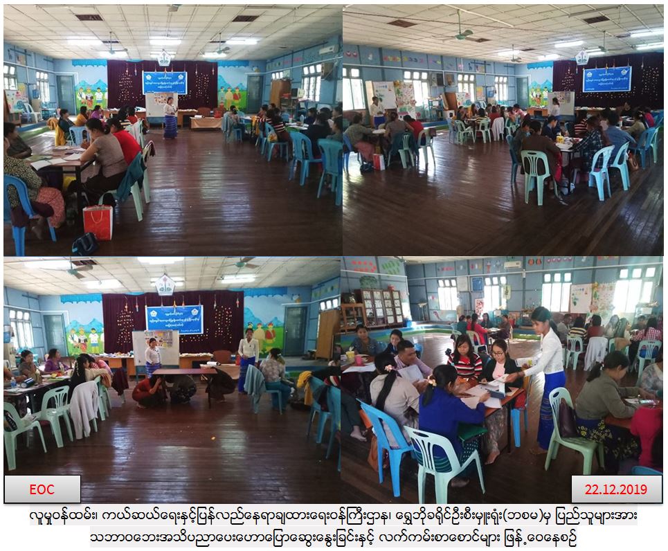 လူမှုဝန်ထမ်း၊ ကယ်ဆယ်ရေးနှင့်ပြန်လည်နေရာချထားရေးဝန်ကြီးဌာန၊ ဘေးအန္တရာယ်ဆိုင်ရာစီမံခန့်ခွဲမှုဦးစီးဌာန၊ ရွှေဘိုခရိုင်ဦးစီးမှူးရုံးမှ တာဝန်ရှိသူများသည် (၂၂-၁၂-၂၀၁၉)ရက်နေ့တွင် ရွှေဘိုမူလတန်းကြိုကျောင်းတွင် လူမှုဝန်ထမ်းဦးစီးဌာနမှဖွင့်လှစ်သည့် ECCDသင်တန်းတွင် ဦးစီးဌာန၏လုပ်ငန်းတာဝန်များဝ သဘာဝဘေးအန္တရာယ်ဆိုင်ရာဆောင်ရန်/ရှောင်ရန်များ ဆွေးနွေးဟောပြောခဲ့ရာ သင်တန်းသား/သူ (၃၀)ဦးတက်ရောက်ခဲ့ပြီး တက်ရောက်လာသူများအား လက်ကမ်းစာဆောင်များဖြန့်ဝေပေးခဲ့ကြောင်း သတင်းရရှိပါသည်။