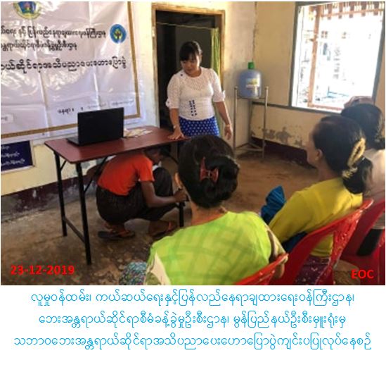 လူမှုဝန်ထမ်း၊ ကယ်ဆယ်ရေးနှင့် ပြန်လည်နေရာချထားရေးဝန်ကြီးဌာန၊ ဘေးအန္တရာယ်ဆိုင်ရာစီမံခန့်ခွဲမှုဦးစီးဌာန၊ မွန်ပြည်နယ်ဦးစီးမှူးရုံးမှ တာဝန်ရှိသူများသည် (၂၃-၁၂-၂၀၁၉) ရက်နေ့(၁၀:၃ဝ)နာရီမှ(၁၂:၀၀)နာရီအထိ ကျိုက်မရောမြို့နယ်၊ ရန်မျိုးအောင်ရပ်ကွက် အုပ်ချုပ်ရေးမှူးရုံး၌ ပြည်သူလူထု(၁၀၀)ဦးခန့်ကို သဘာဝဘေးအန္တရာယ်များနှင့် ပတ်သက်သော ဆောင်ရန် / ရှောင်ရန်အချက်များအား သိရှိလိုက်နာဆောင်ရွက်နိုင်ရေးအတွက် သဘာဝဘေးအသိပညာပေး ဟောပြောပွဲကျင်းပပြုလုပ်ခဲ့ပြီး တက်ရောက်လာသူများအား သဘာဝဘေး အန္တရာယ်နှင့် ပတ်သတ်သောအသိပညာပေးဗီဒီယိုပြသ၍ လက်ကမ်းစာစောင်များဖြန့်ဝေခဲ့ကြောင်း သတင်းရရှိပါသည်။