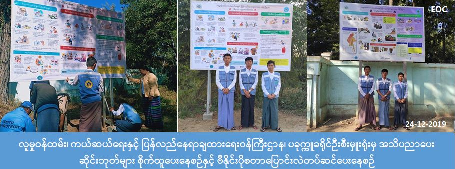 လူမှုဝန်ထမ်း၊ ကယ်ဆယ်ရေးနှင့် ပြန်လည်နေရာချထားရေးဝန်ကြီးဌာန၊ ဘေးအန္တရာယ်ဆိုင်ရာ စီမံခန့်ခွဲမှုဦးစီးဌာန၊ ပခုက္ကူခရိုင်ဦးစီးမှူးရုံးမှတာဝန်ရှိသူများသည် (၂၄-၁၂-၂၀၁၉) ရက်နေ့တွင် ပခုက္ကူမြို့၊ ရွှေချောင်းအဝိုင်းလမ်းဆုံတွင် မီးဘေးအသိပညာပေးဆိုင်းဘုတ်တစ်ခုစိုက်ထူခဲ့ပြီး ပခုက္ကူမြို့၊ ပြည်သူ့ဆေးရုံကြီးရှေ့၊ အထက(၂)ကျောင်းရှေ့နှင့် ရေစကြိုမြို့ရှောင်လမ်းဆုံတို့တွင်ရှိသော ဗီနိုင်းပိုစတာများနေရာတွင် လျှပ်စီးလက်ခြင်းနှင့်မိုးကြိုးဘေး၊ မီးဘေးနှင့် ငလျင်ဘေးအသိပညာပေး ဗီနိုင်းပိုစတာများအား ပြောင်းလဲတပ်ဆင်ခဲ့ကြောင်း သိရှိရပါသည်။