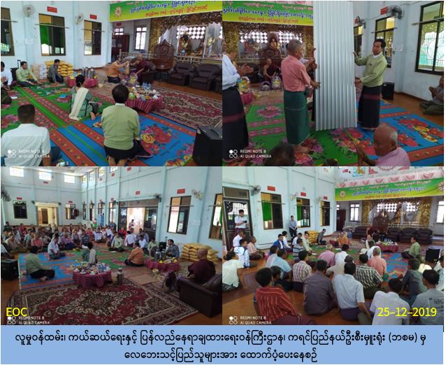 လူမှုဝန်ထမ်း၊ ကယ်ဆယ်ရေးနှင့်ပြန်လည်နေရာချထားရေး၀န်ကြီးဌာန၊ ဘေးအန္တရာယ်ဆိုင်ရာ စီမံခန့်ခွဲမှုဦးစီးဌာန၊ ကရင်ပြည်နယ်ဦးစီးမှူးရုံးမှ တာဝန်ရှိသူများသည် (၂-၉-၂၀၁၉) ရက်နေ့ တွင် ဘားအံမြို့နယ်၊ ခရားအတွင်းကျေးရွာ၌ မိုးသည်းထန်စွာရွာသွန်း၍ လေပြင်းတိုက်ခတ် မှုကြောင့် ဘုန်းကြီးကျောင်း (၁) ကျောင်းနှင့် နေအိမ် (၂၃) လုံး အမိုးလန်ပျက်စီးခဲ့ပါသည်။ အဆိုပါ အမိုးလန်ပျက်စီးနေအိမ် (၂၃) လုံးနှင့် ဘုန်းကြီးကျောင်း (၁) ကျောင်းတို့အတွက် (၇) ပေ အလူဇင့်သွပ် (၃၂၉) ချပ်အား (၂၅-၁၂-၂၀၁၉) ရက်နေ့တွင် ကရင်ပြည်နယ်ဝန်ကြီးချုပ်၊ ပြည်နယ် လူမှုရေးဝန်ကြီးနှင့်အတူ ပြည့်သူ့လက်ဝယ်အရောက် သွားရောက်ထောက်ပံ့ပေးအပ်ခဲ့ပါကြောင်း သိရှိရပါသည်။