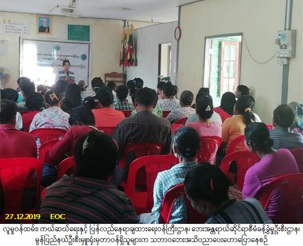 လူမှုဝန်ထမ်း၊ ကယ်ဆယ်ရေးနှင့် ပြန်လည်နေရာချထားရေးဝန်ကြီးဌာန၊ ဘေးအန္တရာယ်ဆိုင်ရာစီမံခန့်ခွဲမှုဦးစီး ဌာန၊ မွန်ပြည်နယ်ဦးစီးမှူးရုံးမှတာဝန်ရှိသူများသည် (၂၇-၁၂-၂၀၁၉) ရက်နေ့၊ (၁၀:၃၀)နာရီမှ (၁၂:၀၀)နာရီ အချိန်အထိ ကျိုက်မရောမြို့၊ အောင်သုခရပ်ကွက်၊ အုပ်ချုပ်ရေးမှူးရုံး၌ သဘာဝဘေးအသိပညာပေးဟောပြောပွဲ ကျင်းပပြုလုပ်ခဲ့ရာ ရပ်ကွက်နေပြည်သူ (၁၀၀)ဦးခန့်တက်ရောက်ခဲ့ပြီး တက်ရောက်လာသူများအား သဘာဝဘေးနှင့်စပ်လျဉ်း၍ ဆောင်ရန်/ရှောင်ရန်အသိပညာပေးလက်ကမ်းစာစောင်များ ဖြန့်ဝေပေးခဲ့ပါကြောင်း သတင်းရရှိပါသည်။