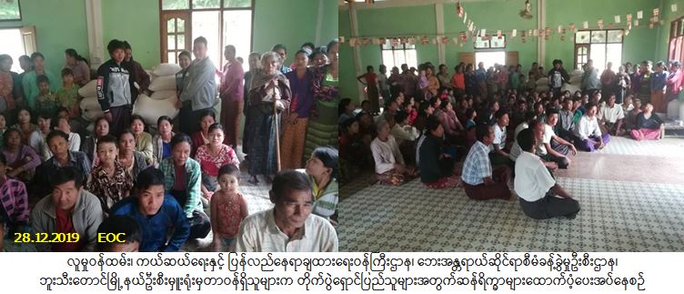 လူမှုဝန်ထမ်း၊ ကယ်ဆယ်ရေးနှင့် ပြန်လည်နေရာချထားရေးဝန်ကြီးဌာန၊ ဘေးအန္တရာယ်ဆိုင်ရာစီမံခန့်ခွဲမှုဦးစီး ဌာန၊ ဘူးသီးတောင်မြို့နယ်ဦးစီးမှူးရုံးမှတာဝန်ရှိသူများသည် ဘူးသီးတောင်မြို့၊ မြို့မရပ်ကွက်၊ လမ်းမ ဘုန်းတော်ကြီးကျောင်းသို့ ထပ်မံရောက်ရှိလာကြသော တိုက်ပွဲရှောင်ပြည်သူ အိမ်ထောင်စု(၄၂)စု၊ လူဦးရေ (၁၈၀)ဦးအတွက် ဆန်ရိက္ခာ (၁၄) ရက်စာ ဆန်(၂၆)အိတ်၊ (၆)ပြည်ကို (၂၈-၁၂-၂၀၁၉)ရက်နေ့တွင် ထောက်ပံ့ပေးအပ်ခဲ့ပါကြောင်း သတင်းရရှိပါသည်။