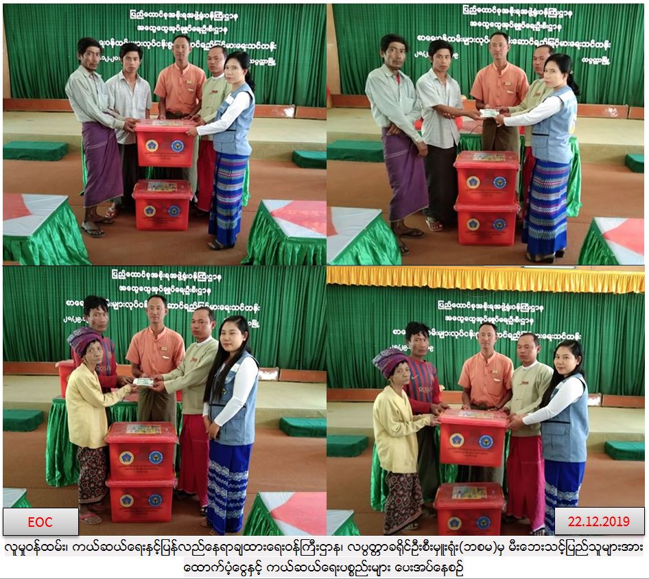 လူမှုဝန်ထမ်း၊ ကယ်ဆယ်ရေးနှင့်ပြန်လည်နေရာချထားရေးဝန်ကြီးဌာန၊ ဘေးအန္တရာယ်ဆိုင်ရာစီမံခန့်ခွဲမှုဦးစီးဌာန၊ လပွတ္တာခရိုင်ဦးစီးမှူးရုံးမှ တာဝန်ရှိသူများသည် လပွတ္တာမြို့နယ်၊အုန်းတစ်ပင်ကျေးရွာအုပ်စု၊ ကြိမ်ချောင်းကျေးရွာတွင် (၂၈-၁၂-၂၀၁၉)ရက်နေ့၌ ဖြစ်ပွားခဲ့သော မီးလောင်မှုကြောင့် မီးဘေးသင့်ခဲ့သောအိမ်ခြေ(၄)လုံးနှင့် လူဦးရေ(၁၇)ဦး တို့အတွက် ကယ်ဆယ်ရေးပစ္စည်း (၁၆)မျိုး အိမ်ထောင်စု (၄)စုစာ၊ အိမ်ဆောက်ပစ္စည်းဖိုးထောက်ပံ့ငွေ (၃၅၀၀၀ဝိ/-)၊ ဆန်ရိက္ခာ (၇)ရက်စာဖိုးထောက်ပံ့ငွေ (၃၅၇၀၀)ကျပ်၊ စုစုပေါင်း (၃၈၅၇၀၀)ကျပ်တို့အား (၃၀-၁၂-၂၀၁၉) ရက်နေ့၊(၁၁း၃၀)နာရီအချိန်တွင် လွှတ်တော်ကိုယ်စားလှယ်၊ မြို့နယ်အထွေထွေအုပ်ချုပ်ရေးဦးစီးဌာနမှတာဝန်ရှိသူများနှင့်အတူ ဘေးသင့်ပြည်သူများထံသို့ ထောက်ပံ့ပေးအပ်ခဲ့ကြောင်း သတင်းရရှိပါသည်။