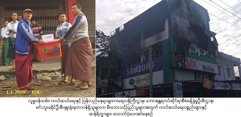 လူမှုဝန်ထမ်း၊ ကယ်ဆယ်ရေးနှင့် ပြန်လည်နေရာချထားရေးဝန်ကြီးဌာန၊ ဘေးအန္တရာယ်ဆိုင်ရာစီမံခန့်ခွဲမှုဦးစီး ဌာန၊ မင်းဘူးခရိုင်ဦးစီးမှူးရုံးမှတာဝန်ရှိသူများသည် မင်းဘူးမြို့၊ အမှတ်(၃)ရပ်ကွက်၊ စည်ပင်သာယာဈေးလမ်း၌ (၁-၁-၂၀၂၀)ရက်နေ့တွင်ဖြစ်ပွားခဲ့သော မီးဘေးကြောင့် အိမ်ခြေ(၂)လုံး၊ အိမ်ထောင်စု(၁)စုမှ လူဦးရေ (၂)ဦးဘေးသင့်ခဲ့ရာ အဆိုပါဘေးသင့်ပြည်သူများအတွက် အိမ်ဆောက်ပစ္စည်းဖိုးထောက်ပံ့ငွေ (၄၀၀,၀၀၀/-) ကျပ်၊ ဆန်ရိက္ခာ(၇)ရက်စာဖိုးထောက်ပံ့ငွေ (၄,၂၀၀/-) ကျပ်နှင့် ကယ်ဆယ်ရေးပစ္စည်း(၁၆)မျိုး အိမ်ထောင်စု(၁)စုစာ တို့ကို (၁-၁-၂၀၂၀)ရက်နေ့၊ (၁၆:၃၀)အချိန်တွင် အမှတ်(၃)ရပ်ကွက်အုပ်ချုပ်ရေးမှူးနှင့်အတူ ပြည်သူများ လက်ဝယ်အရောက် ထောက်ပံ့ပေးအပ်ခဲ့ပါကြောင်း သတင်းရရှိပါသည်။