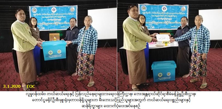 လူမှုဝန်ထမ်း၊ ကယ်ဆယ်ရေးနှင့် ပြန်လည်နေရာချထားရေးဝန်ကြီးဌာန၊ ဘေးအန္တရာယ်ဆိုင်ရာစီမံခန့်ခွဲမှုဦးစီး ဌာန၊ တောင်ငူခရိုင်ဦးစီးမှူးရုံးမှတာဝန်ရှိသူများသည် ပဲခူးတိုင်းဒေသကြီး၊ တောင်ငူခရိုင်၊ ရေတာရှည်မြို့နယ်၊ ပိတောက်ကုန်းကျေးရွာအုပ်စု၊ ပိတောက်ကုန်းကျေးရွာ၌ (၃၀-၁၂-၂၀၁၉)ရက်နေ့တွင်ဖြစ်ပွားခဲ့သော မီးဘေးကြောင့်ပျက်စီးနေအိမ် (၁) လုံး၊ အိမ်ထောင်စု (၁) စုမှ လူဦးရေ (၁) ဦးဘေးသင့်ခဲ့ရာ အဆိုပါဘေးသင့်ပြည်သူများအတွက် အိမ်ဆောက်ပစ္စည်းဖိုးထောက်ပံ့ငွေ (၁၀၀,၀၀၀/-)ကျပ်၊ ဆန်ရိက္ခာ (၇) ရက်စာဖိုးထောက်ပံ့ငွေ (၂,၁၀၀/-)ကျပ်နှင့် ကယ်ဆယ်ရေးပစ္စည်း (၁၉)မျိုး (ပလပ်စတစ်ပုံးအပါ) အိမ်ထောင်စု (၁) စုစာတို့ကို (၃-၁-၂၀၂၀) ရက်နေ့တွင် သွားရောက်ထောက်ပံ့ပေးအပ်ခဲ့ပါကြောင်း သတင်းရရှိပါသည်။