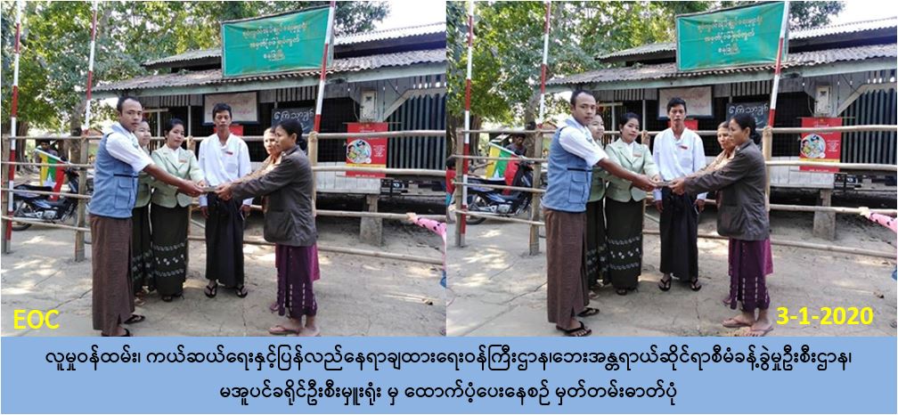 လူမှုဝန်ထမ်း၊ ကယ်ဆယ်ရေးနှင့် ပြန်လည်နေရာချထားရေးဝန်ကြီးဌာန၊ ဘေးအန္တရာယ်ဆိုင်ရာ စီမံခန့်ခွဲမှုဦးစီးဌာန၊ မအူပင်ခရိုင်ဦးစီးမှူးရုံးမှ တာဝန်ရှိသူများသည် မအူပင်ခရိုင်၊ ဓနုဖြူမြို့နယ်၊ အမှတ် (၁၆) ရပ်ကွက်၊ ကမ်းနားလမ်း၌ (၁-၁-၂၀၂၀) ရက်နေ့တွင် ဖြစ်ပွားသော ကမ်းပြိုဘေး ကြောင့် ကြိုတင်ရွှေ့ပြောင်းနေအိမ် (၂)လုံး၊ အိမ်ထောင်စု (၂) စု မှ လူဦးရေ (၁၁) ဦး အတွက် အိမ်ဆောက်ပစ္စည်းဖိုးငွေ (၂၀၀,ဝဝဝ) ကျပ်၊ ဆန်ရိက္ခာ (၇) ရက်စာရန်ပုံငွေ (၂၃,၁၀ဝ)ကျပ်၊ စုစုပေါင်းရန်ပုံငွေ (၂၂၃,၁၀ဝ)ကျပ် အား (၃-၁-၂၀၂၀) ရက်နေ့ (၀၉:၄၅) နာရီအချိန်တွင် ဓနုဖြူမြို့နယ်၊ အထွေထွေအုပ်ချုပ်ရေးဦးစီးဌာနမှ တာဝန်ရှိသူများနှင့်အတူ ကျေးရွာအုပ်ချုပ် ရေးမှူး၊ ရပ်မိရပ်ဖများ၏ ရှေ့မှောက်၌ ဘေးသင့်ပြည်သူများ လက်ဝယ်အရောက် ထောက်ပံ့ပေး အပ်ခဲ့ပါကြောင်း သတင်းရရှိပါသည်။