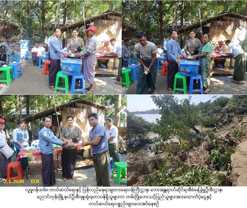 လူမှုဝန်ထမ်း၊ ကယ်ဆယ်ရေးနှင့် ပြန်လည်နေရာချထားရေးဝန်ကြီးဌာန၊ ဘေးအန္တရာယ်ဆိုင်ရာစီမံခန့်ခွဲမှုဦးစီး ဌာန၊ ညောင်တုန်းမြို့နယ်ဦးစီးမှူးရုံးမှတာဝန်ရှိသူများသည် တိုင်းဒေသကြီးလွှတ်တော်ကိုယ်စားလှယ်နှင့်အတူ ညောင်တုန်းမြို့နယ်၊ ကျောင်းစုကျေးရွာအုပ်စု၊ ကျောင်းစုကျေးရွာ၌ (၁-၁-၂၀၂၀) ရက်နေ့တွင် ဖြစ်ပွားခဲ့သော ကမ်းပြိုဘေးကြောင့် ပြိုကျပျက်စီးနေအိမ် (၅) လုံး၊ ကြိုတင်ဖျက်သိမ်းပြောင်းရွှေ့နေအိမ် (၉)လုံး၊ အိမ်ထောင်စု (၁၄) စုမှ လူဦးရေ (၅၆) ဦးတို့ဘေးသင့်ခဲ့ရာ အဆိုပါဘေးသင့်ပြည်သူများအတွက် ကယ်ဆယ်ရေးပစ္စည်း (၁၅) မျိုး (၅) အိမ်ထောင်စုစာ၊ ဆန်ရိက္ခာ (၇) ရက်စာဖိုးထောက်ပံ့ငွေ (၁၁၇,၆၀ဝ/-) ကျပ်၊ အိမ်ဆောက်ပစ္စည်းဖိုးထောက်ပံ့ငွေ (၁,၉၀၀,၀၀ဝ/-) ကျပ်တို့ကို (၂-၁-၂၀၂၀)ရက်နေ့၊ (၁၄:၂၀)နာရီအချိန်တွင် ပြည်သူလက်ဝယ် အရောက် ထောက်ပံ့ပေးအပ်ခဲ့ပါကြောင်း သတင်းရရှိပါသည်။