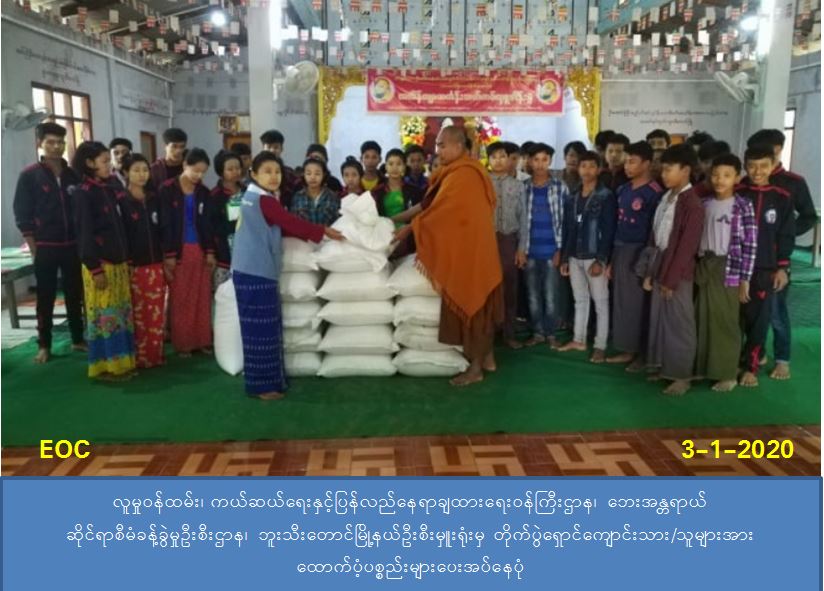 လူမှုဝန်ထမ်း၊ ကယ်ဆယ်ရေးနှင့်ပြန်လည်နေရာချထားရေးဝန်ကြီးဌာန၊ ဘေးအန္တရာယ် ဆိုင်ရာစီမံခန့်ခွဲမှုဦးစီးဌာန၊ ဘူးသီးတောင်မြို့နယ်ဦးစီးမှူးရုံးမှ တာဝန်ရှိသူများသည် (၃-၁-၂၀၂၀)ရက်နေ့တွင် တိုက်ပွဲများဖြစ်ပွားမှုကြောင့့် ဘူးသီးတောင်မြို့နယ်၊ ရွာမကျေးရွာအုပ်စု၊ ရွာမကျေးရွာ၊ သီရိမင်္ဂလာဘုန်းတော်ကြီးကျောင်းတွင်နေထိုင်၍ ပညာသင်ကြားနေကြ သည့် ကျောင်းသား/သူ (၄၉) ဦးအတွက် ဆန်ရိက္ခာ (၁) လစာ၊ ဆန် (၁၅) အိတ် ၊(၇) ပြည်၊ (၄) ဘူးအား သွားရောက်ထောက်ပံ့ခဲ့ကြောင်းသတင်းရရှိပါသည်။