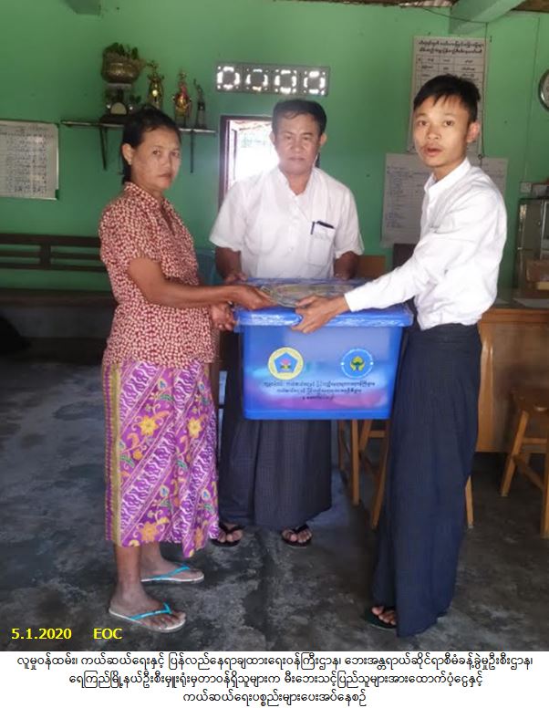 လူမှုဝန်ထမ်း၊ ကယ်ဆယ်ရေးနှင့် ပြန်လည်နေရာချထားရေးဝန်ကြီးဌာန၊ ဘေးအန္တရာယ်ဆိုင်ရာစီမံခန့်ခွဲမှုဦးစီး ဌာန၊ ရေကြည်မြို့နယ်ဦးစီးမှူးရုံးမှတာဝန်ရှိသူများသည် ကျုံပျော်မြို့နယ်၊ ပင်လုံရပ်ကွက်၊ ခဲဘောင်ရပ်၌ (၃၀-၁-၂၀၂၀) ရက်နေ့တွင် ဖြစ်ပွားခဲ့သောမီးဘေးကြောင့် ပျက်စီးနေအိမ်(၁)လုံး၊ အိမ်ထောင်စု (၁)စုမှ လူဦးရေ (၂) ဦးဘေးသင့်ခဲ့ရာ အဆိုပါဘေးသင့်ပြည်သူများအတွက် အိမ်ဆောက်ပစ္စည်းဖိုးထောက်ပံ့ငွေ (၁၀၀,၀၀ဝ/-) ကျပ်၊ ဆန်ရိက္ခာ(၇)ရက်စာဖိုးထောက်ပံ့ငွေ (၄,၂၀ဝ/-) ကျပ်နှင့် ကယ်ဆယ်ရေးပစ္စည်း(၁၇)မျိုး(၁)အိမ်ထောင်စုစာတို့ကို (၅-၁-၂၀၂၀)ရက်နေ့၊ (၁၃:၀၀)နာရီအချိန်တွင် တာဝန်ရှိသူများရှေ့မှောက်၌ ပြည်သူ့လက်ဝယ်အရောက် ထောက်ပံ့ပေးအပ်ခဲ့ပါကြောင်း သတင်းရရှိပါသည်။