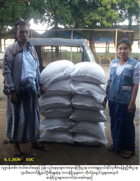 လူမှုဝန်ထမ်း၊ ကယ်ဆယ်ရေးနှင့် ပြန်လည်နေရာချထားရေးဝန်ကြီးဌာန၊ ဘေးအန္တရာယ်ဆိုင်ရာစီမံခန့်ခွဲမှုဦးစီး ဌာန၊ ဘူးသီးတောင်မြို့နယ်ဦးစီးမှူးရုံးမှတာဝန်ရှိသူများသည် ဘူးသီးတောင်မြို့နယ်၊ ဆေးအိုးကျကျေးရွာ၊ စက်ခေါ်ကျေးရွာ၊ သိန်းတန်(ရခိုင်)ကျေးရွာ၊ သိန်းတန်(ဘင်္ဂါလီ)ကျေးရွာနှင့် သံခြေကျေးရွာ၊ စုရပ်စခန်း(၅)ခုတို့ရှိ ရိက္ခာထပ်မံလိုအပ်လျက်ရှိသော တိုက်ပွဲရှောင်အိမ်ထောင်စု(၁၀၅)စု၊ လူဦးရေ(၄၄၉)ဦးအတွက် ဆန်ရိက္ခာ (၁)လစာ ဆန်(၁၄၀)အိတ်၊ (၇)ပြည်၊ (၄)ဘူးတို့ကို (၆-၁-၂၀၂၀)ရက်နေ့တွင် ထောက်ပံ့ပေးအပ်ခဲ့ပါကြောင်း သတင်းရရှိပါသည်။