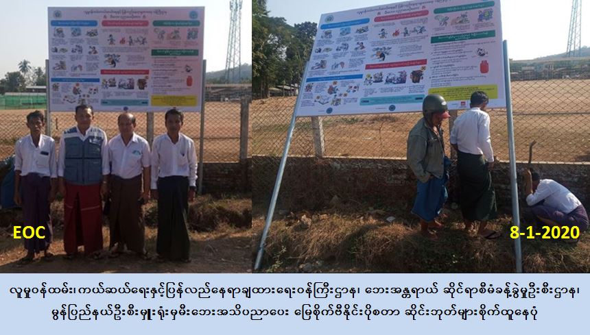 လူမှုဝန်ထမ်း၊ ကယ်ဆယ်ရေးနှင့်ပြန်လည်နေရာချထားရေးဝန်ကြီးဌာန၊ ဘေးအန္တရာယ် ဆိုင်ရာစီမံခန့်ခွဲမှုဦးစီးဌာန၊ မွန်ပြည်နယ်ဦးစီးမှူးရုံးမှ တာဝန်ရှိသူများသည် မော်လမြိုင်မြို့၊ လှိုင်ရပ်ကွက်၊ အထက (၂) ဘောလုံးကွင်းရှေ့နှင့် ဇေယျာမြိုင်ရပ်ကွက် အုပ်ချုပ်ရေးမှူးရုံး ရှေ့တို့၌ (၇ – ၁ – ၂၀၂၀ ) ရက်နေ့တွင် မီးဘေးအသိပညာပေး မြေစိုက်ဗီနိုင်းပိုစတာ ဆိုင်းဘုတ်များစိုက်ထူခဲ့ကြောင်း သတင်းရရှိပါသည်။