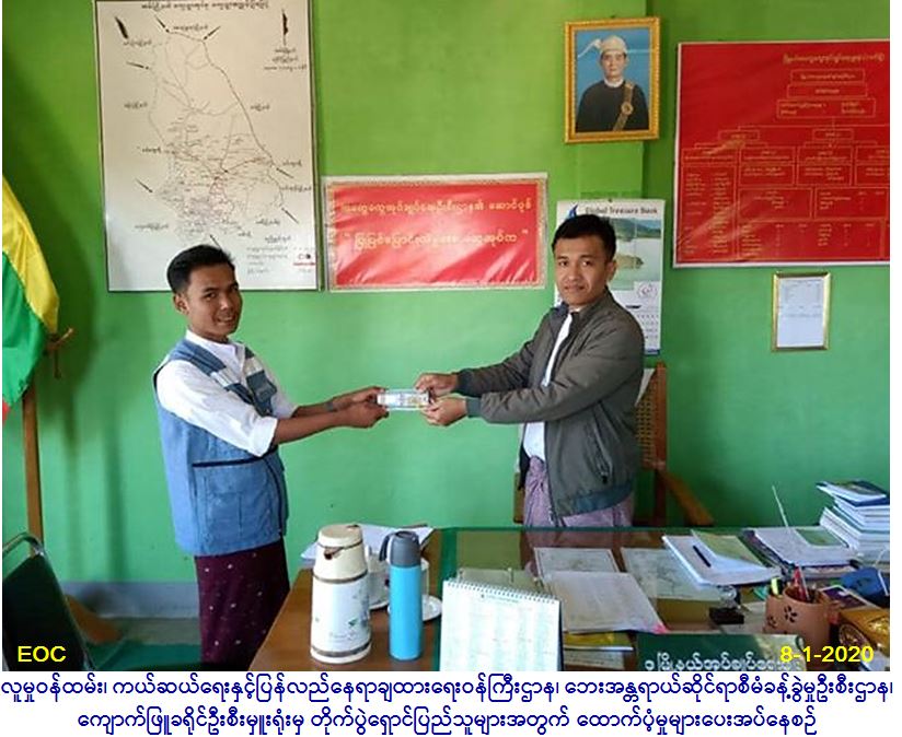 ကျောက်ဖြူခရိုင်၊ အမ်းမြို့၊ ကဇုကိုင်းကျေးရွာအုပ်စု၊ ရှောက်ခြုံကျေးရွာ၊ သရက်ပင်ချောင်းကျေးရွာ၊ အုန်းတည်ချောင်းကျေးရွာ၊ အမ်းမြို့နယ်၊ ဒါးလက်အုပ်စု၊ ဒါးလက်တောင်ရွာ၊ ဒါးလက်ရွာဟောင်းရွာနှင့် မြေပုံမြို့နယ်၊ စညှင်းကျေးရွာအုပ်စု၊ စညှင်းကျေးရွာတို့တွင် (၂.၁.၂၀၂၀) ရက်နေ့၌ ရောက်ရှိခိုလှုံလျက်ရှိသော တိုက်ပွဲရှောင်အိမ်ထောင်စု(၁၄)စုမှ ကျား(၂၄)ဦး၊ မ(၂၉)ဦး၊ စုစုပေါင်း (၅၃) ဦးတို့အတွက် ဆန်ရိက္ခာ (၂) ပတ်စာတန်ဖိုးငွေ (၂၂၂၆၀၀/-) တို့ကို (၈.၁.၂၀၂၀)ရက်နေ့ (၁၃:၀၀)နာရီအချိန်တွင် လူမှုဝန်ထမ်း၊ ကယ်ဆယ်ရေးနှင့်ပြန်လည်နေရာချထားရေးဝန်ကြီးဌာန၊ ဘေးအန္တရာယ်ဆိုင်ရာစီမံခန့်ခွဲမှုဦးစီးဌာန၊ ကျောက်ဖြူ ခရိုင်ဦးစီးမှူးရုံးမှ တာဝန်ရှိသူများသည် အမ်းမြို့နယ်အထွေထွေအုပ်ချုပ်ရေးဦးစီးဌာနမှ ဒုတိယမြို့နယ်အုပ်ချုပ်ရေးမှူးထံသို့ လွှဲပြောင်းထောက်ပံ့ပေးအပ်ခဲ့ပါကြောင်း သတင်းရရှိပါသည်။