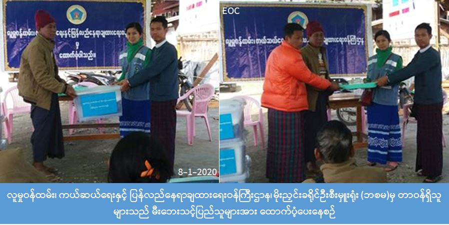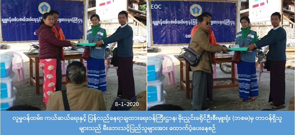 ကချင်ပြည်နယ်၊ မိုးညှင်းခရိုင်၊ ဖားကန့်မြို့နယ်၊ ဝါရာဇွပ်ကျေးရွာအုပ်စု၊ ရှဒူဇွပ်ကျေးရွာတွင် (၃၀-၁၂-၂၀၁၉) ရက်နေ့ (၂၃:၃၀) အချိန်၌ဖြစ်ပွားခဲ့သော မီးဘေးကြောင့် ဘေးသင့်အိမ်ခြေ (၁၁)လုံး၊ အိမ်ထောင်စု (၁၄) စု၊ လူဉီး ရေ (၅၆) ဉီးတို့အတွက် ကယ်ဆယ်ရေးပစ္စည်း (၁၇) မျိုး၊ အိမ်ဆောက်ပစ္စည်းဖိုးငွေ (၂,၂၀၀,၀၀ဝ) ကျပ်နှင့် ဆန်ရိက္ခါဖိုးငွေ (၁၁၇,၆၀ဝ) ကျပ်တို့အား လူမှုဝန်ထမ်း၊ ကယ်ဆယ်ရေးနှင့် ပြန်လည်နေရာချထားရေးဝန်ကြီးဌာန၊ မိုးညှင်းခရိုင်ဉီးစီးမှူးရုံးမှတာဝန်ရှိသူများသည် (၈-၁-၂၀၂၀)ရက်နေ့တွင် ထောက်ပံ့ပေးအပ်ခဲ့ကြောင်း သိရှိရပါသည်။